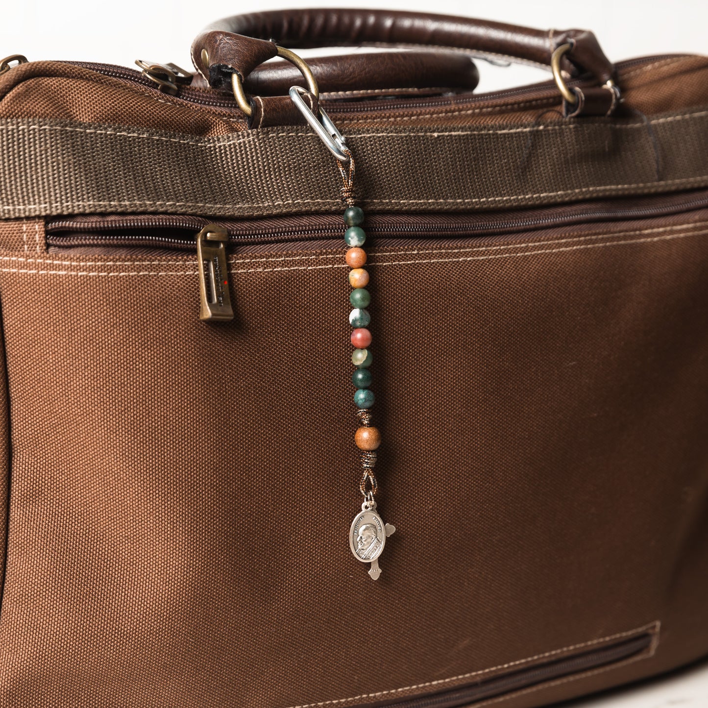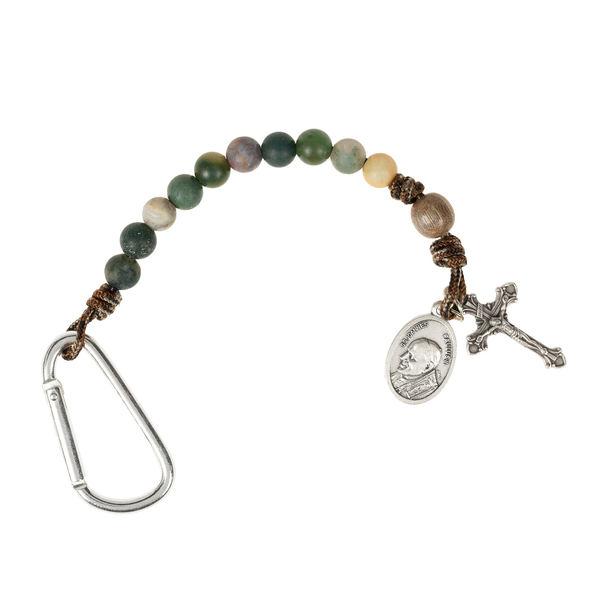 Pope St. John Paul II wrote that our very contact with creation has deep, restorative power and links us to our Creator. This tenner is a part of our Brave Beads collection, celebrating the outdoors, and this special saint who was an adventurous outdoorsman. It features a rich grey wood Our Father bead, and smaller Indian Agate Hail Mary beads, in tones that inspire reflection on the beauty of nature, from deepest greens, corals, and browns to golds, white and ivory, all marbled and blended splendidly. They are the rich, full tones of the green earth, mantle of the Holy Father, and the brightness of the heavens.