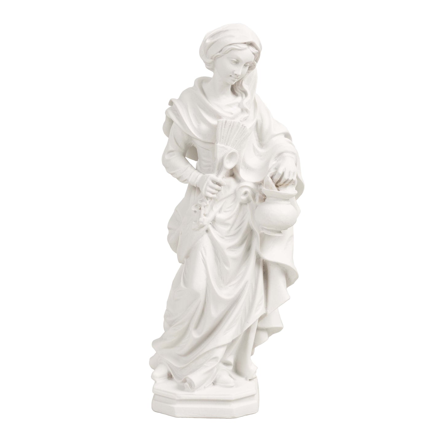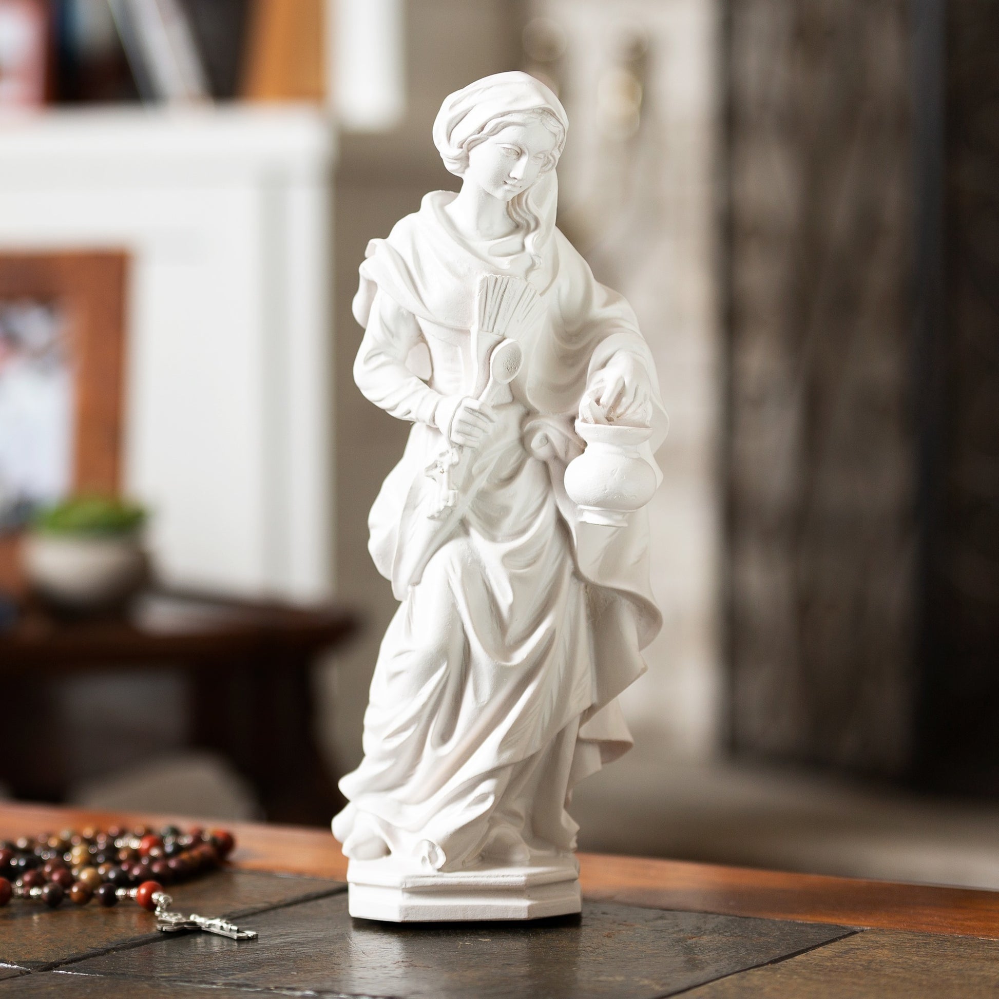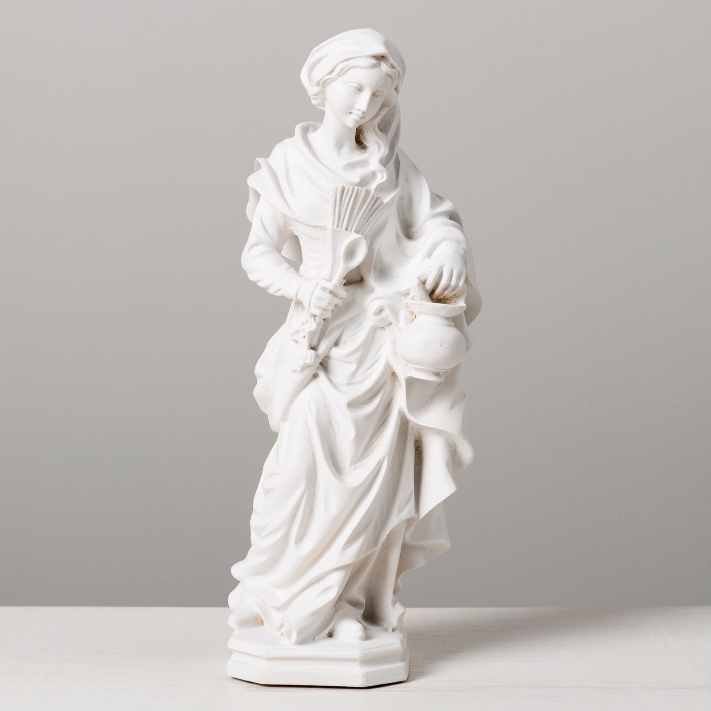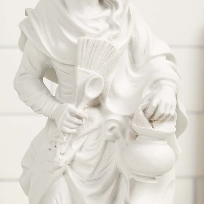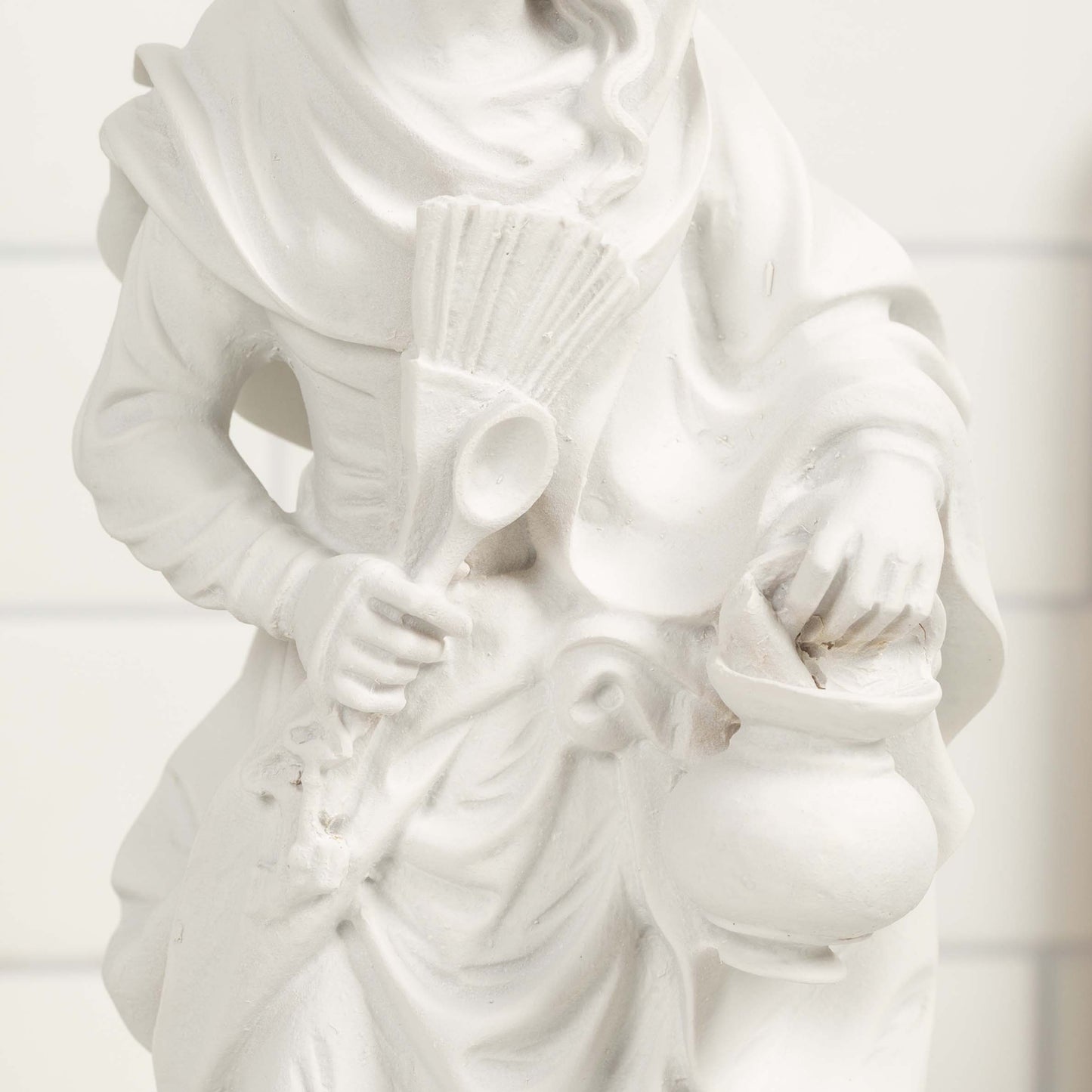We often imagine Our Blessed Mother in her heavenly glory, yet this beautiful Kitchen Madonna helps us to envision her as our earthly mother who knows what it means to be a wife and a mother.  Ideal for any kitchen, she can be placed on a counter, in a China cabinet, or on an island or table.  Symbols abound in this statue: the key represents the safety in the house and the way to heaven, the kettle symbolizes the nourishment of body and soul, and the broom represents cleanliness of our earthly and spiritual lives.