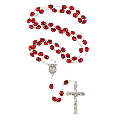 This charming rosary celebrates the ladybug, which was named for the Virgin Mary, As tradition goes, during the Middle Ages a plague of small insects, most likely aphids, attacked the crops and threatened Europe with starvation. The people prayed to Our Lady for her intercession. Their prayers were answered when a cloud of tiny orange-red insects speckled with black arrived and ate the offending pests. In gratitude, the people gave them the honorary name "Lady Bugs." In this rosary, glossy red ladybug beads combine with silver tone findings. A Miraculous Medal centerpiece and flowered Crucifix are the finishing touches. A fun, eye-catching rosary that makes a unique gift for a gardener, or any lover of ladybugs and the great outdoors.