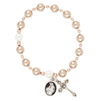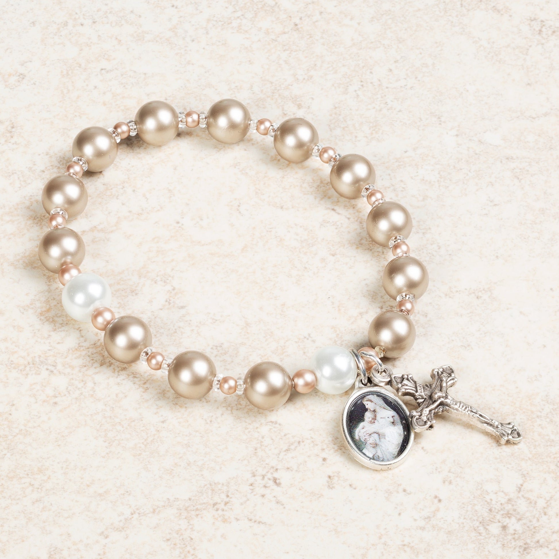 On this rosary bracelet is a little charm that features this captivating image, and lustrous Platinum, white and almond Swarovski glass pearls softly glow and beautifully complement the serene scene. A petite crucifix reminds you to offer your prayers to Christ as you meditate on his life. A profoundly inspiring rosary bracelet for both daily prayer and elegant occasions.