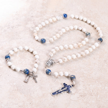 This breathtaking set beautifully represents the Marian apparitions to St. Bernadette at Lourdes. The colors of the elegant rosary and rosary bracelet evoke the clothing of Our Lady, as well as the miraculous spring that appeared at Her command. A fantastic gift for any devotee of Our Lady!