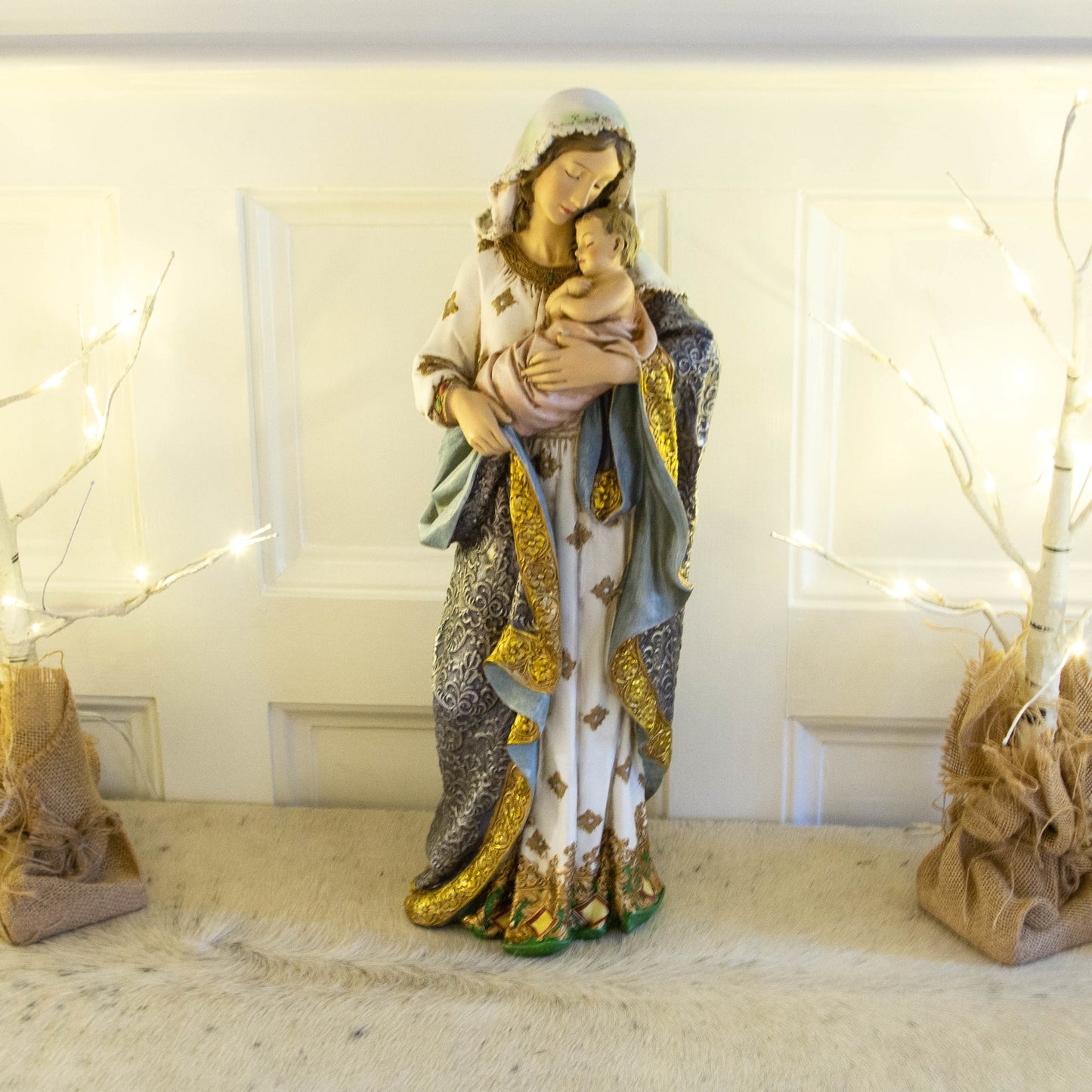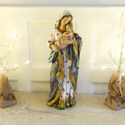 This sweet, yet well-sized statue is ornately designed, and perfectly celebrates Mary, the Mother of Jesus.  We know that Our Blessed Mother always points us to her Son and this exquisitely sculpted figure wonderfully expresses this truth.  Perfect for your parish as a gift or to display in a prominent spot in your own home.