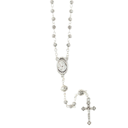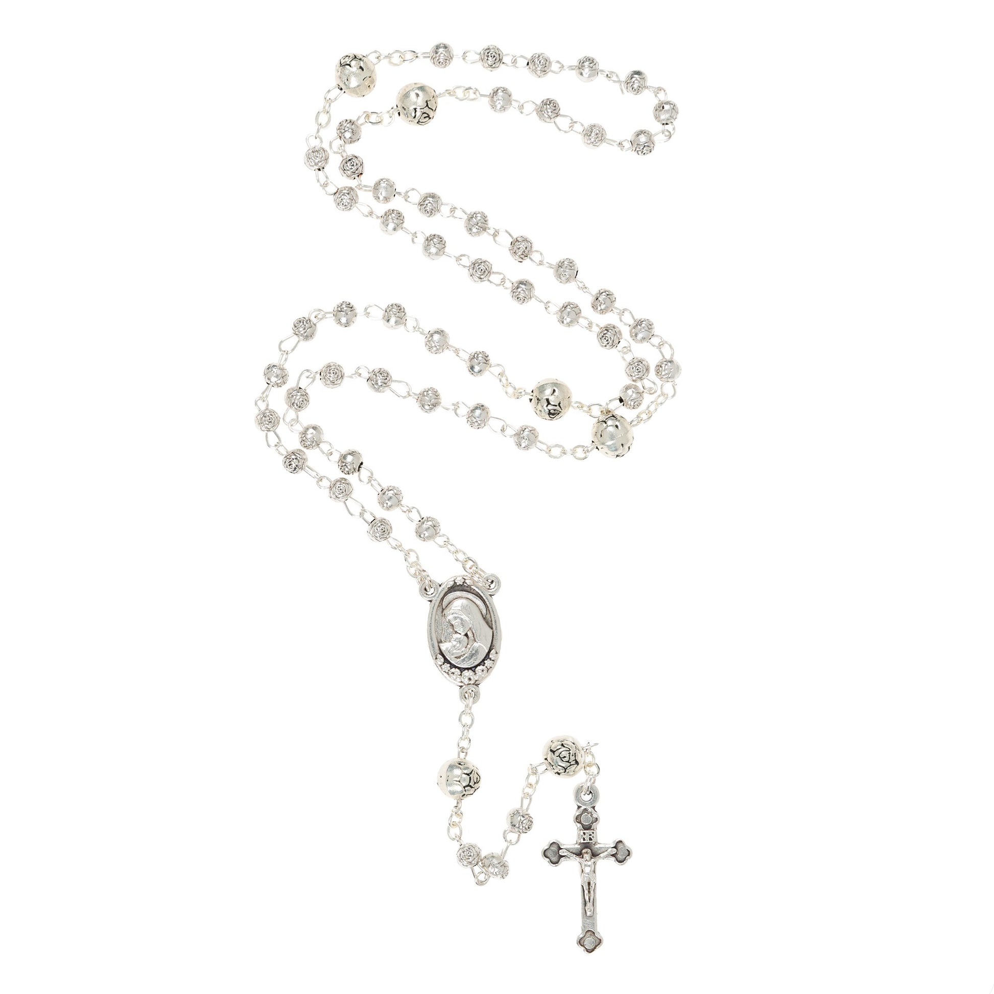 This beautiful rosary holder is designed to perfectly match and safeguard the delicate rosary inside. The top of the box displays a tender image of Mary holding Sleeping Baby Jesus. The bottom half has a petite silver rosary made with rosebud beads. This sweet set reminds us that when we pray the rosary, we are crowning Our Lady in roses which never fade away. A touching gift for girls and women of all ages that can be left out for display, or carried in a purse or pocket for frequent use.