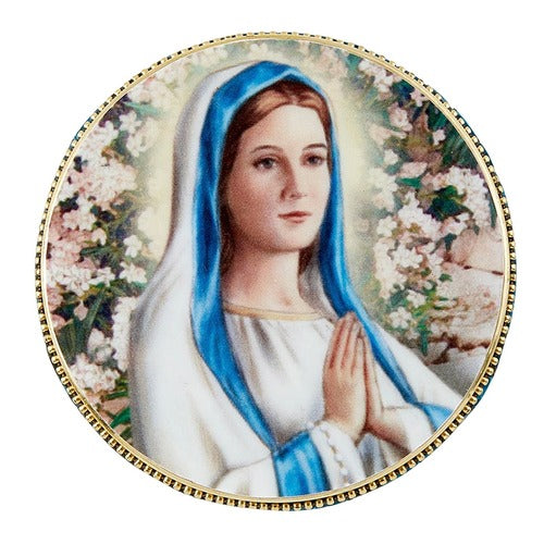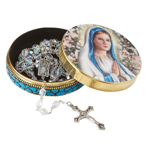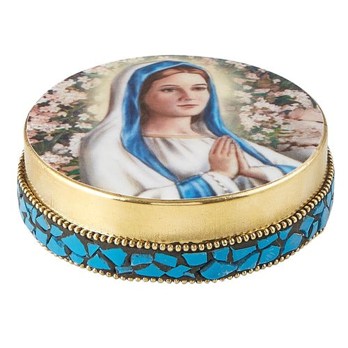 This rosary case is adorned with a beautiful image of Our Lady in prayer among garden flowers, with stunning full color detail. The case has polished brass edging and blue, crushed stone mosaic accents. The interior liner is plush so your rosary will be protected when not in use. This lovely accent is perfect for keeping your rosary close by on a bedside table, or anywhere else in your home.