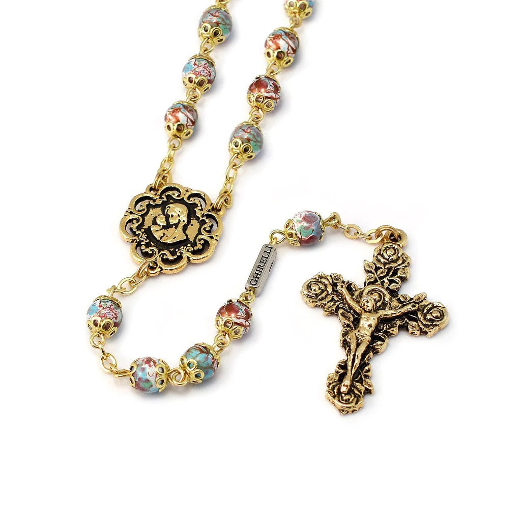 A gorgeous rosary for Mother's Day, a birthday, or to commemorate a woman's special occasion! The glass beads on this Italian Mary Love Rosary feature a vibrant floral design, complimented by a rose crucifix. The gold plated centerpiece shows Our Lady lovingly holding the Christ Child.