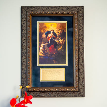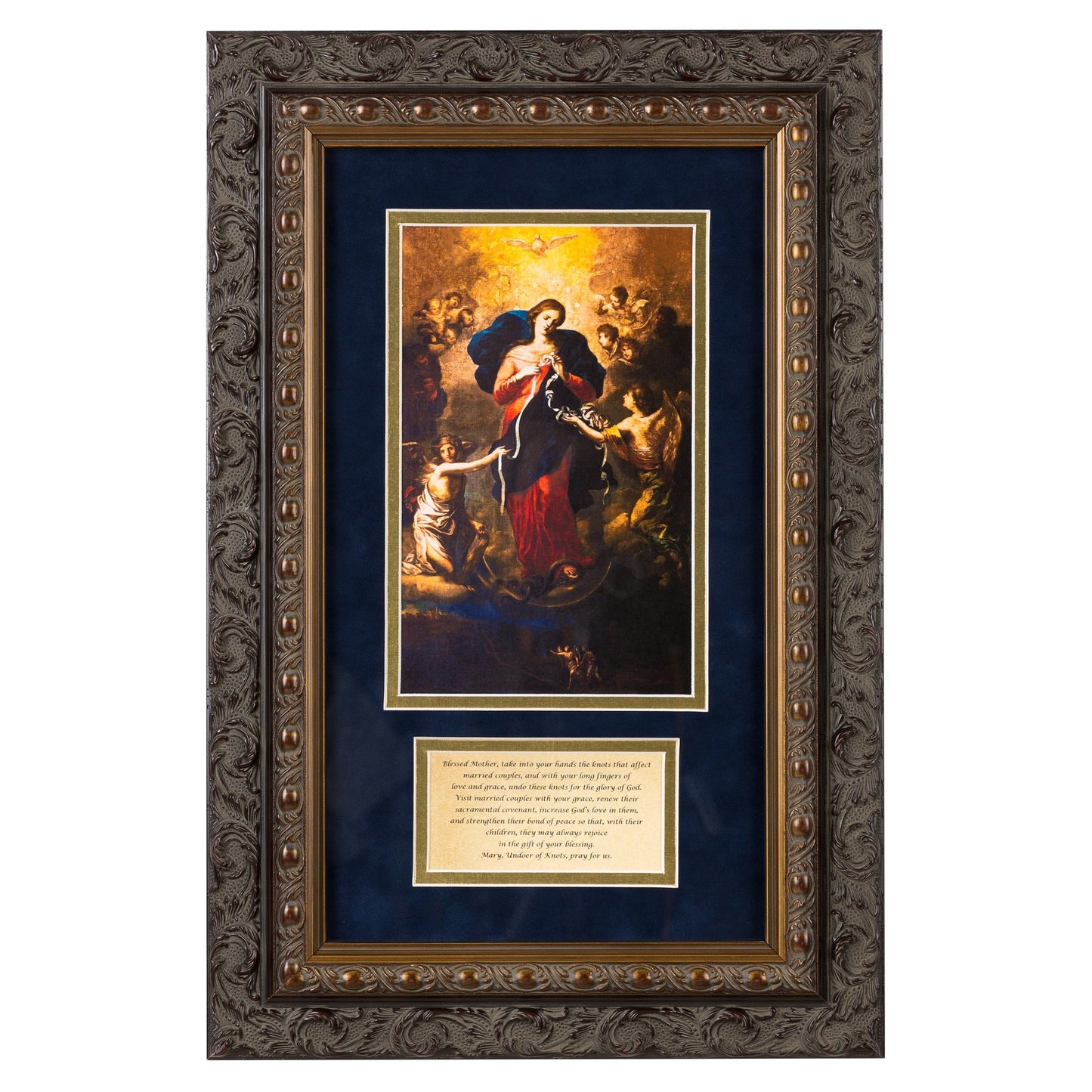 This image of "Our Lady Undoer of Knots" was inspired by a real German couple and their story of marital disunity, struggle, intercession, and powerful reconciliation. Pope Francis helped to spread the devotion to "Mary, Undoer of Knots", one of his favorite devotions, throughout the world. This image of the original "Mary, Undoer of Knots" has undergone professional digital restoration to remove the effects of 300 years of aging and candle-smoke. Surrounded by a deep blue matting, this image comes with the following prayer to Our Lady Undoer of Knots underneath: