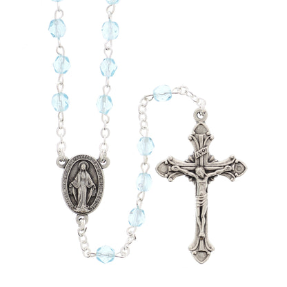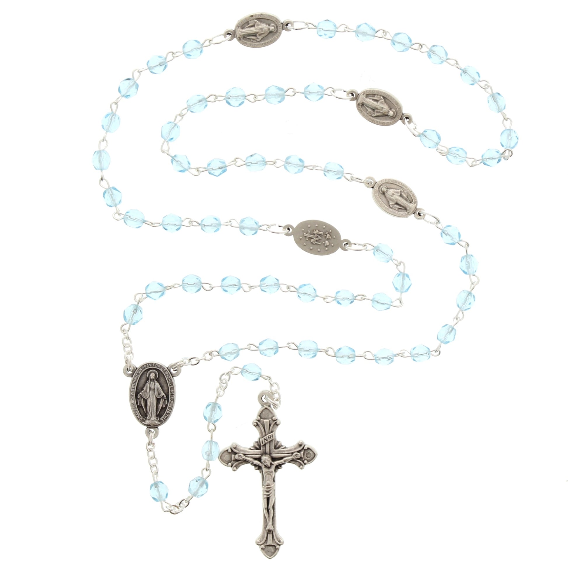 This elegant, light blue rosary features petite Miraculous Medals as Our Father beads. A graceful arrangement of pale blue crystals make up the rest of the beads, creating a gentle devotional that any Catholic is sure to cherish. Makes a beautiful gift for Mother's Day.