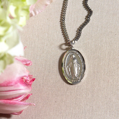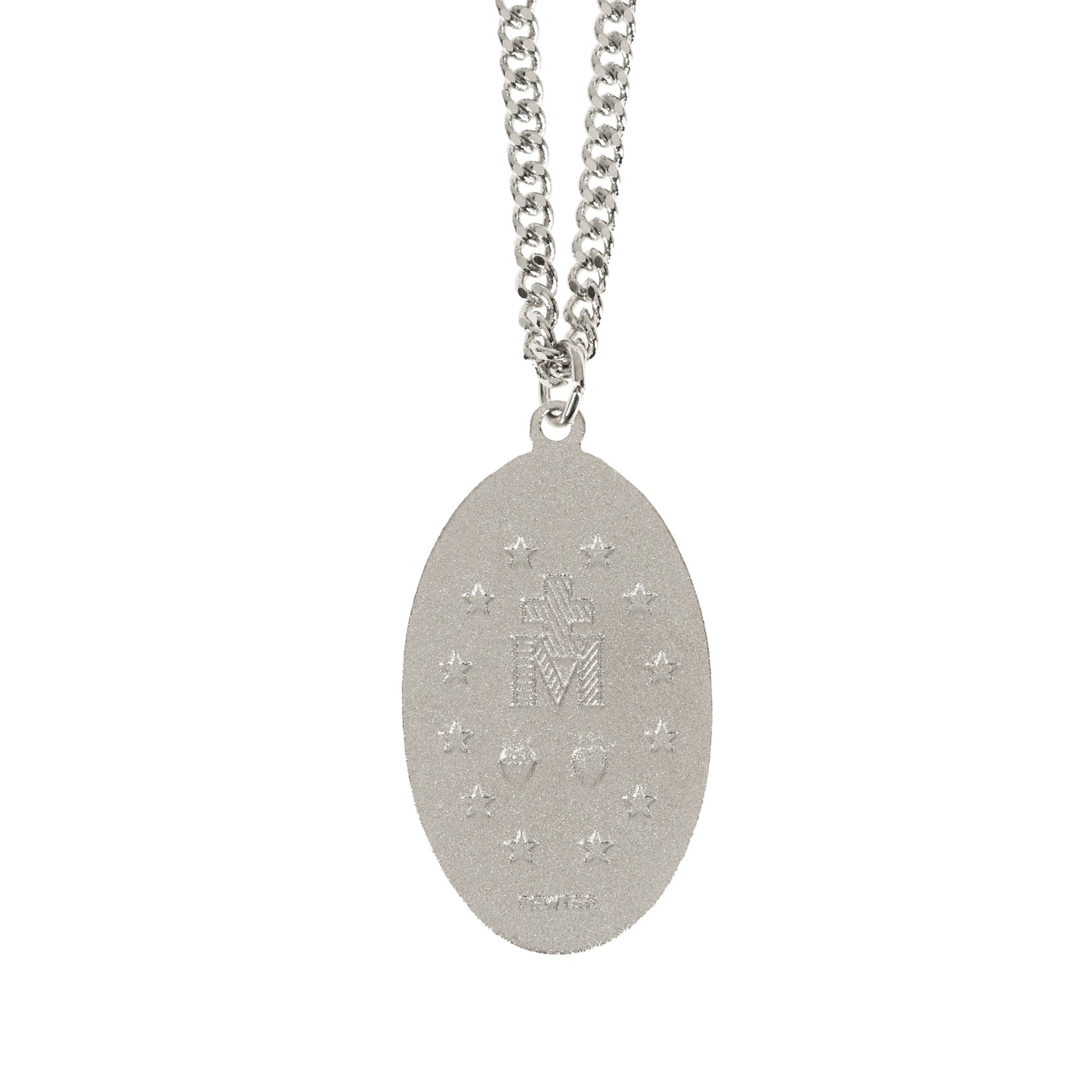 One of our most popular Miraculous Medal necklaces in the original oval shape, with the traditional insignia on the reverse. Generously sized for both men and women, it features a sturdy and lengthy chain, rhodium plated for durability and shine.