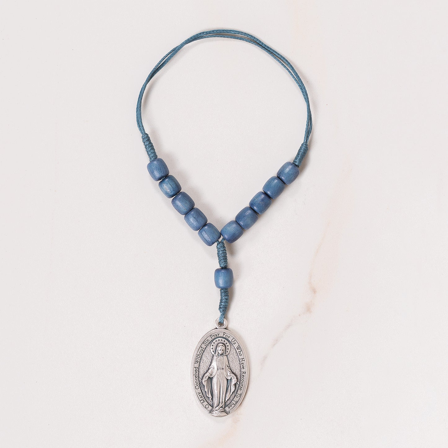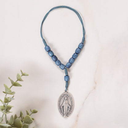 This attractive one decade rosary features a corded design for durability, rich blue wood beads, a generously sized Miraculous Medal, and a large loop to fit over doorknobs, hang on rearview mirrors, or carry along wherever you go.