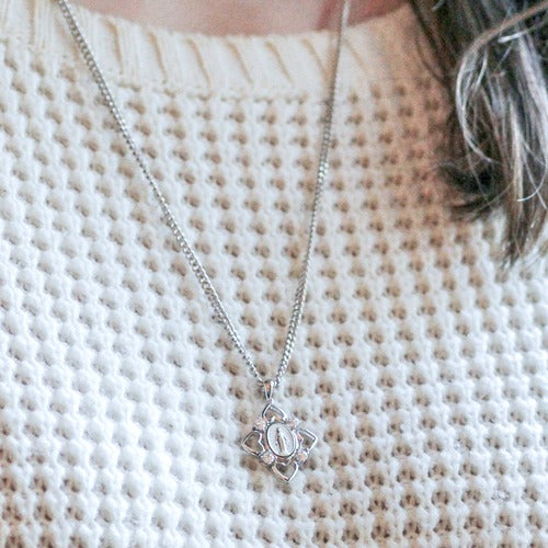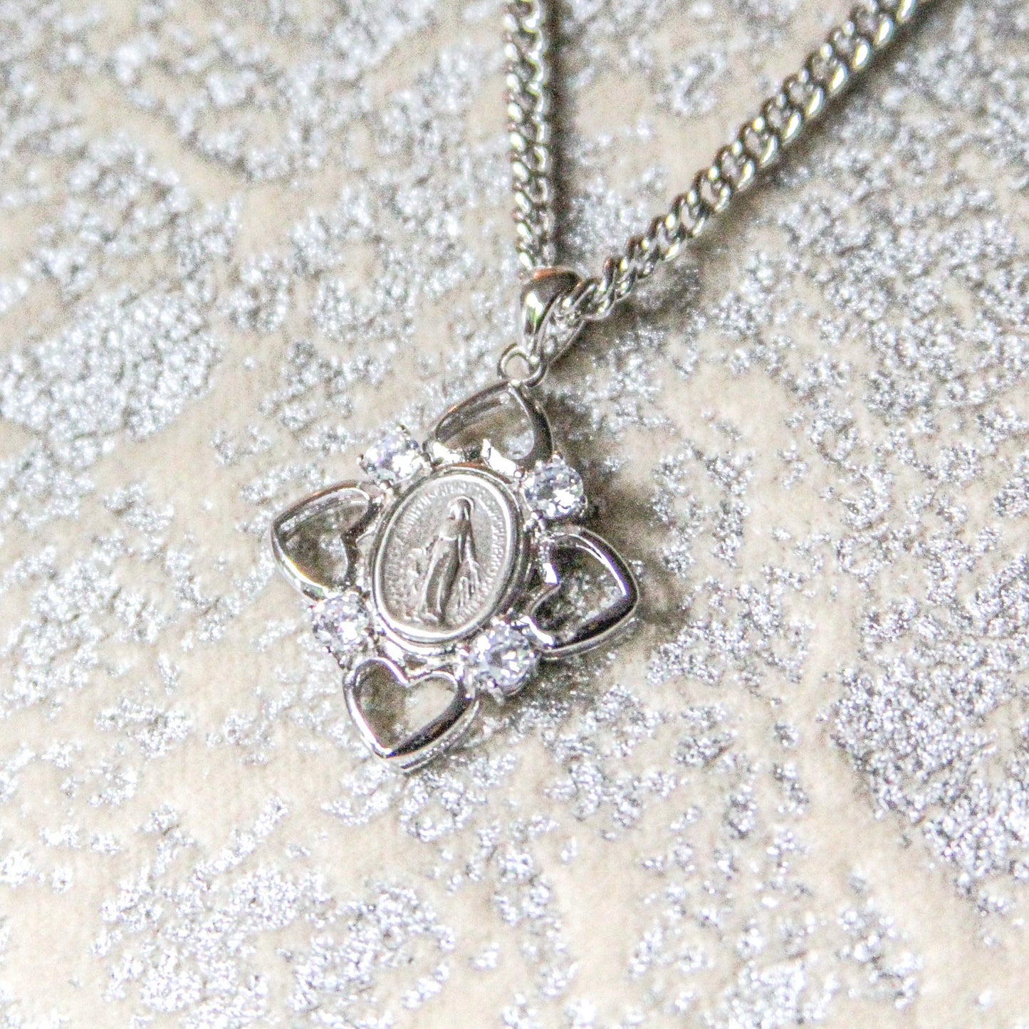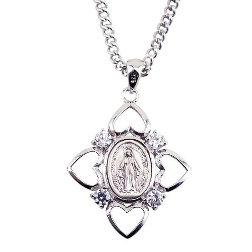 This beautiful Miraculous Medal necklace is encircled by four hearts and four clear crystal cubic zirconia gemstones. The gorgeous pendant and rhodium chain makes a perfect gift for any occasion. Wearing a necklace featuring the Blessed Mother is a reflection of the faith and devotion of the wearer and inspires awe to all who see it.