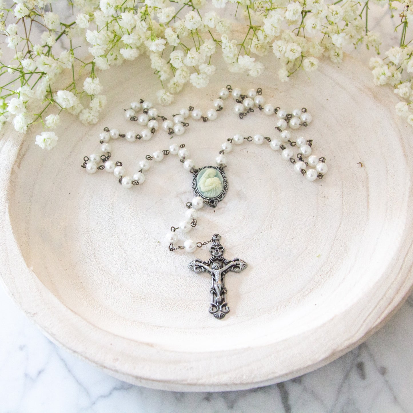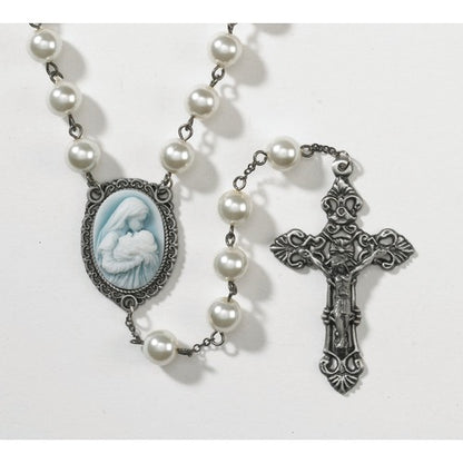 This breathtaking rosary captures the love between Mary and the Christ Child, celebrating the unique bond between mother and child. The centerpiece is an exquisite rendering of the Mother's Kiss, and the ornate Baroque crucifix beautiful caps off the string of iridescent pearl beads. Durable and high-quality, this makes an incredible gift for a Catholic mom on Mother's Day.