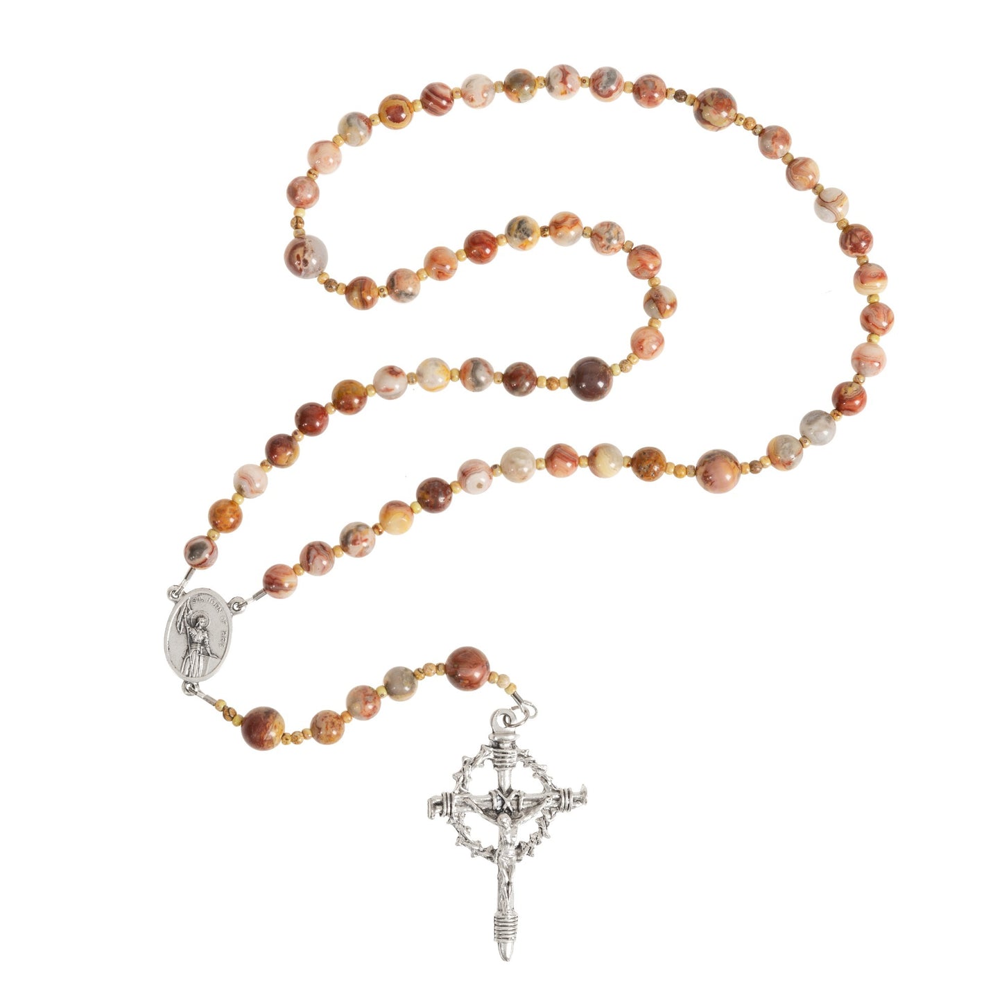 Our handcrafted, commemorative rosary is made as a tribute to the Cathedral of Notre Dame. The stone beads are made of agate and were selected to showcase the beautiful marbled tones found in the walls of the cathedral itself. The Italian Crown of Thorns crucifix reminds us of the relics saved from the fire. The Italian centerpiece features a courageous St. Joan of Arc, the patroness of France, lifting her banner in victory. A prayer card with the Mysteries of the Rosary is included.