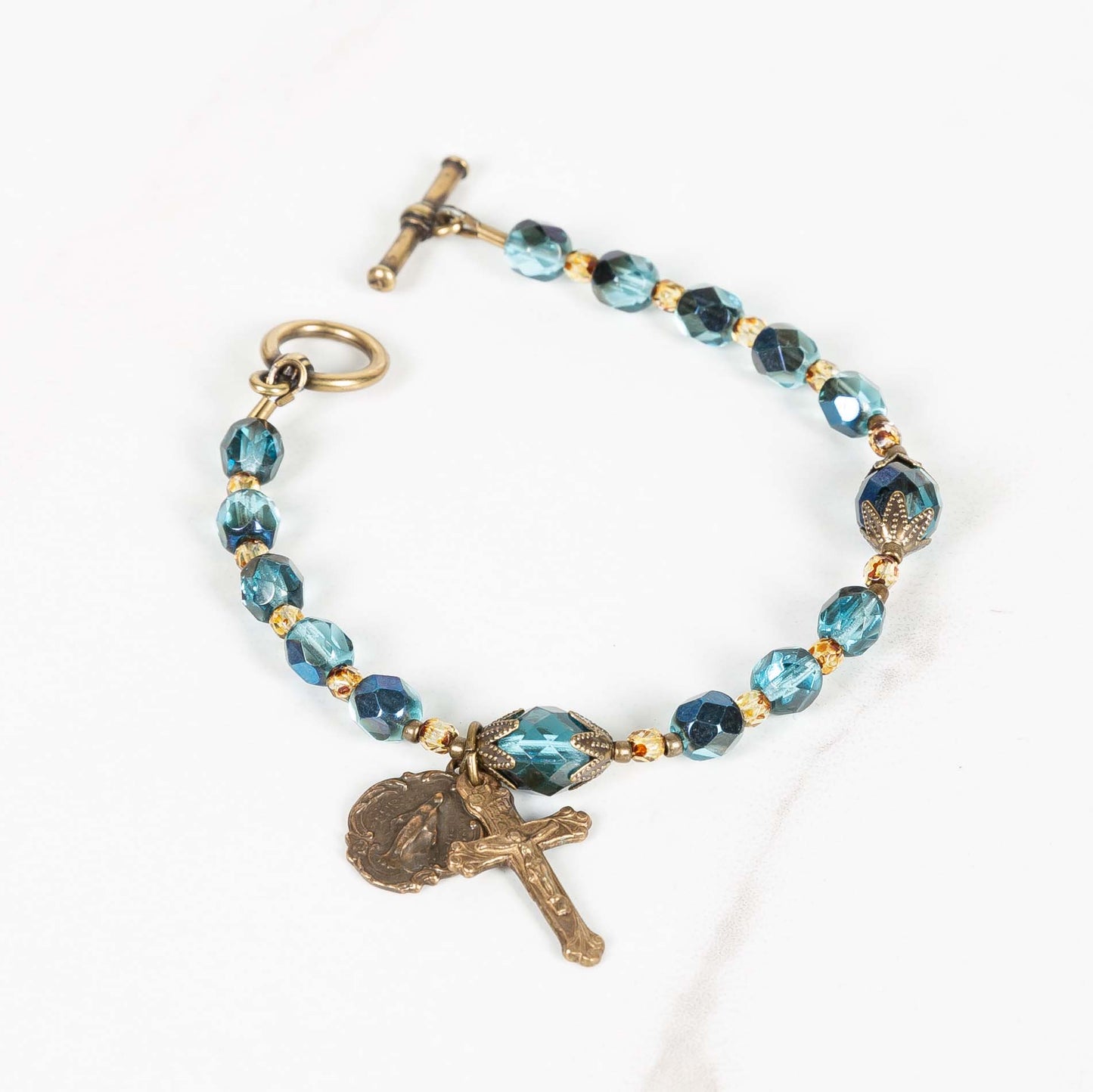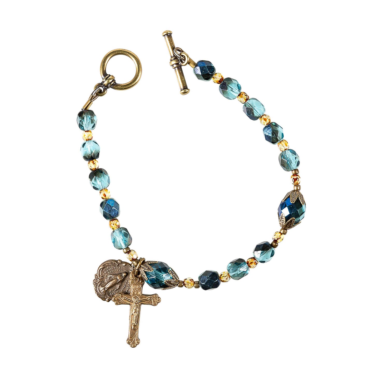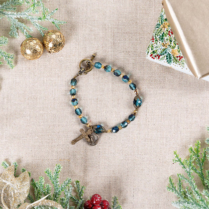 It revives the image of those same stars, which called all men to fall on their knees before Emmanuel - God With Us. Czech Firepolished crystal rounds in deep and elegant blue and teal are faceted to disperse light beautifully. Petite spacers in tortoise gold recall the Star of Bethlehem as it urged the Magi onward. Antique bronze caps crown the slightly larger Our Father beads, with elegant, star-shaped points remind us of the vast night when choirs of Angels sang His glory. A timeless and ornate Miraculous Medal and Crucifix in antique bronze are the baroque and stunning finish to this finely handcrafted bracelet. An antique brass ring and bar clasp holds this piece securely on her wrist.