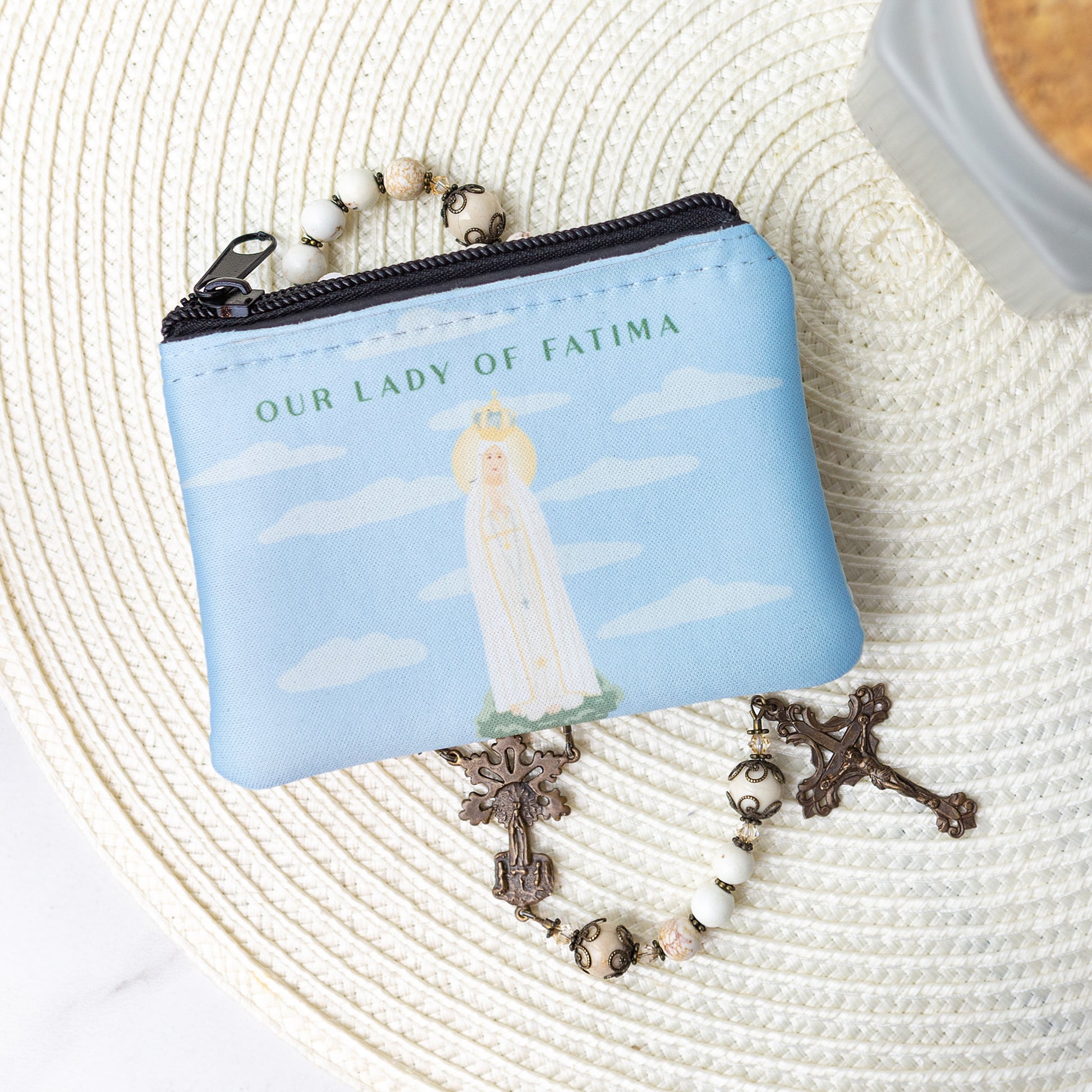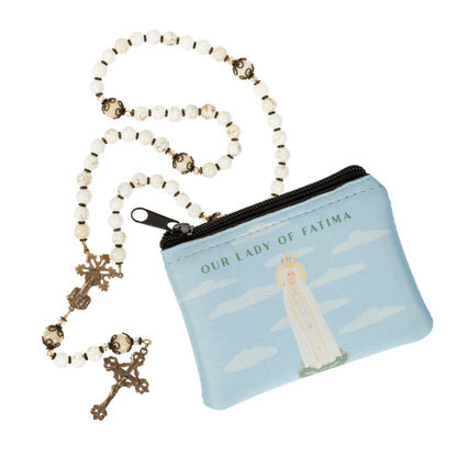 This rosary and rosary pouch are gifted together in this exclusive set to provide not only an exquisite rosary but also a zipper closure rosary pouch. Praying the daily Rosary is a central tenet to the message of Fatima, use this Fatima rosary and rosary pouch as fantastic way to honor her desires. These two items are a perfect match as the white and ivory colors from the rosary beautifully reflect the colors from the rosary pouch which depicts Our Lady of Fatima as a sweet and caring mother. The centerpiece of the rosary also has an image of Our Lady of Fatima and the three shepherd children. Keep this beautiful rosary safe and secure in this rosary pouch which fits in any pocket, purse, or backpack. We are offering free personalization for the rosary pouch so you can make it a special gift for a devoted Catholic female who loves the Rosary.
