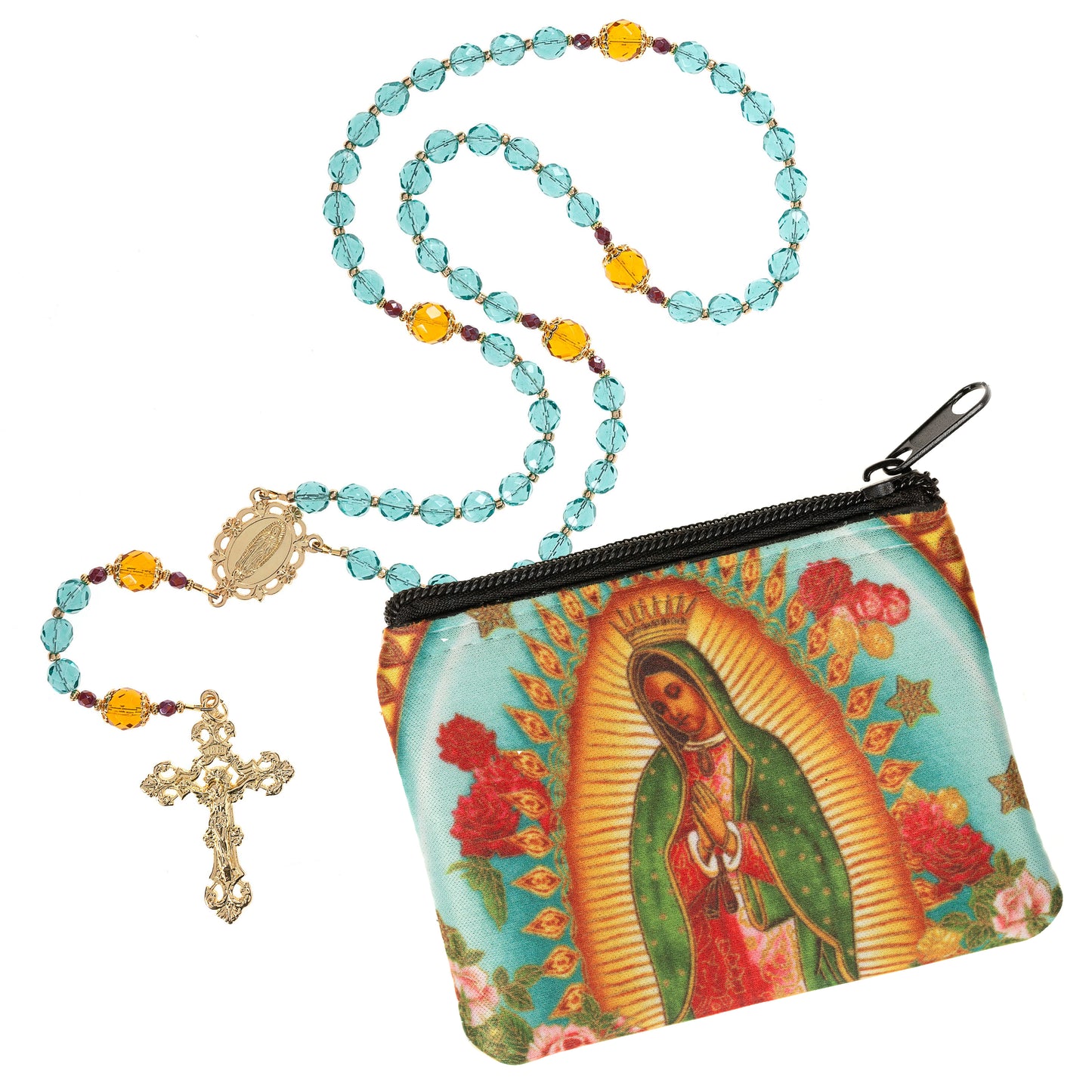 This rosary and rosary pouch are gifted together in this exclusive set to provide not only an exquisite rosary but with it a zipper closure rosary pouch. These two items are a perfect match as the turquoise, red, and gold colors from the rosary beautifully reflect the vibrant colors from the pouch which features Our Lady of Guadalupe. The centerpiece of the rosary also depicts Our Lady as she appeared to Juan Diego, an image which was miraculously imprinted on his tilma and still exists today. TheĀ Hail Marys of this rosary are a striking turquoise fire-polished crystal that reflects the light beautifully and reminds us of the beauty of the Virgin of Guadalupe.She is the patroness of Mexico, the Americas, and the Unborn. Keep this beautiful rosary safe and secure in this rosary pouch which fits in any pocket, purse, or backpack. Get the pouch personalized on the back to make a special Catholic gift for a female with a strong devotion to the Virgin of Guadalupe.Ā