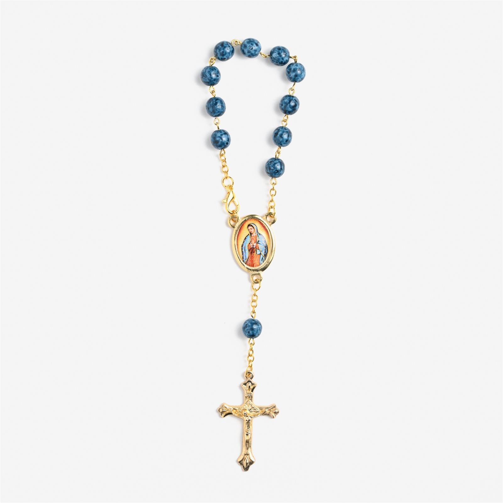 Boldly proclaim your love for Our Lady with this breathtaking auto rosary. Hang these blue crystal beads in your car as a reminder to ask for her motherly protection as you travel. This faith-filled gift for new drivers and car owners is highlighted by a full-color image of the Miraculous Medal as the centerpiece. Features gold tone medals and a convenient lobster clasp.