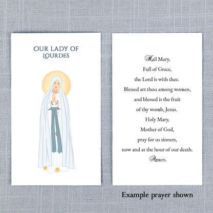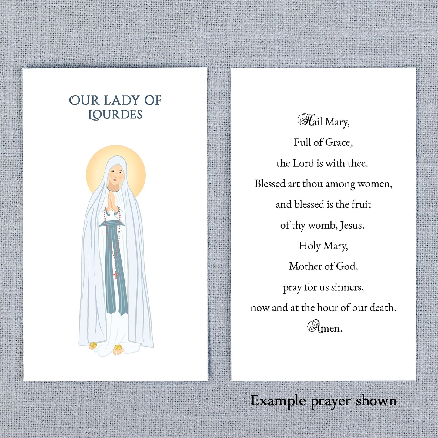 This charming prayer card feature the cherished design of Our Lady of Lourdes. The gorgeous colors and fine detail are a great tool in prayer as you lift your heart and mind towards Heaven. This prayer card encourages devotion towards Our Blessed Mother as our greatest intercessor in Heaven. She is a loving Mother who so desires her children to stay on the path to sanctity, encouraging and comforting them along the way. Get this prayer card personalized by choosing which prayer you would like on the back of them. This prayer card is a great small devotional item to hand out at Church, parish groups, and classrooms.