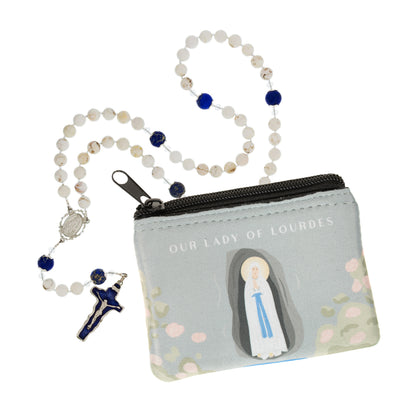 This rosary and rosary pouch are gifted together in this exclusive set to provide not only an exquisite rosary but with it a zipper closure rosary pouch. These two items are a perfect match as the white, silver, and blue colors from the rosary beautifully reflect Our Lady of Lourdes who is depicted on this rosary pouch. The centerpiece of the rosary also depicts Our Lady and St. Bernadette in the grotto of Lourdes. We are offering free personalization for this rosary pouch which can keep your beautiful rosary safe and secure as you go about your day. It can fit in any pocket, purse, or backpack. Invoke the healing powers of Our Lady by asking for her intercessor for you or a loved one. Makes a sweet gift for someone in need of some healing or intercession.