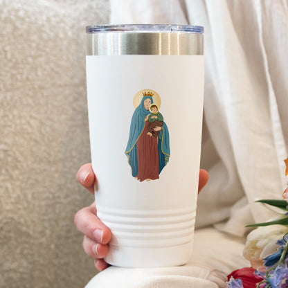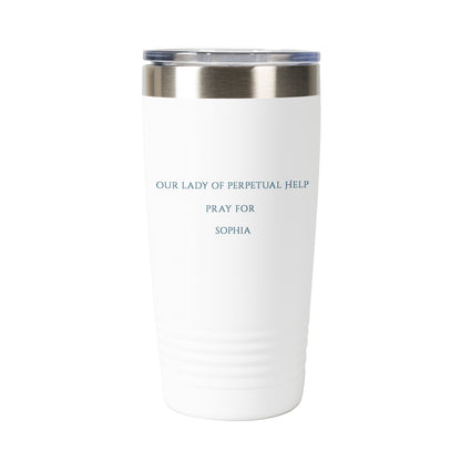 Express your love for Our Lady of Perpetual Help with this charming tumbler. This travel mug conveniently fits in most cup holders and is comfortable to hold in your hand. The image of Our Lady of Perpetual Help features with the crown of Heaven upon her head, the crescent moon under her feet and the child Jesus in her arms. The image is a gracious reminder that Mary is always ready to come to our aid and give us her loving care and assistance. The reverse side of the tumbler will say "Our Lady of Perpetual Help" along with your personalization. Carry this tumbler around with you wherever you go and let it be a reminder of Mary's constant care and aid to those who beseech her intercession.. This travel mug makes a great gift for someone who has a devotion to Our Lady of Perpetual Help and likes to keep their hot and colds drinks with them on the go.