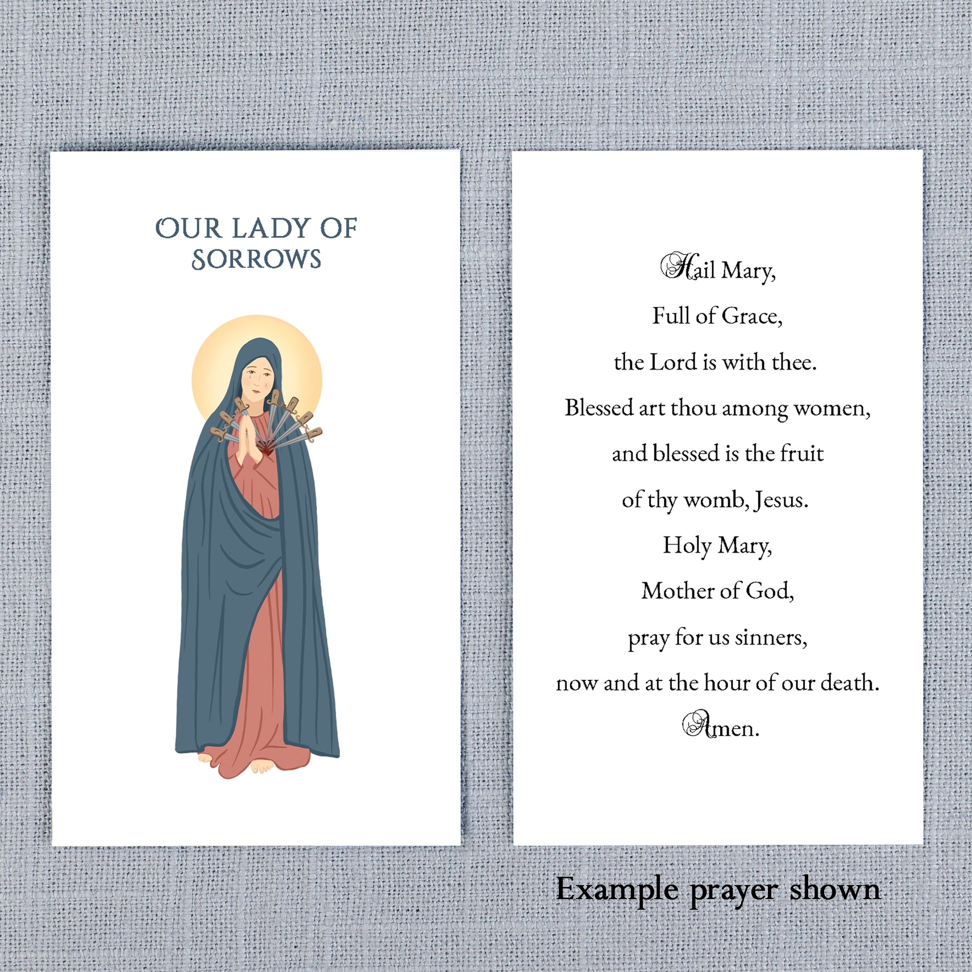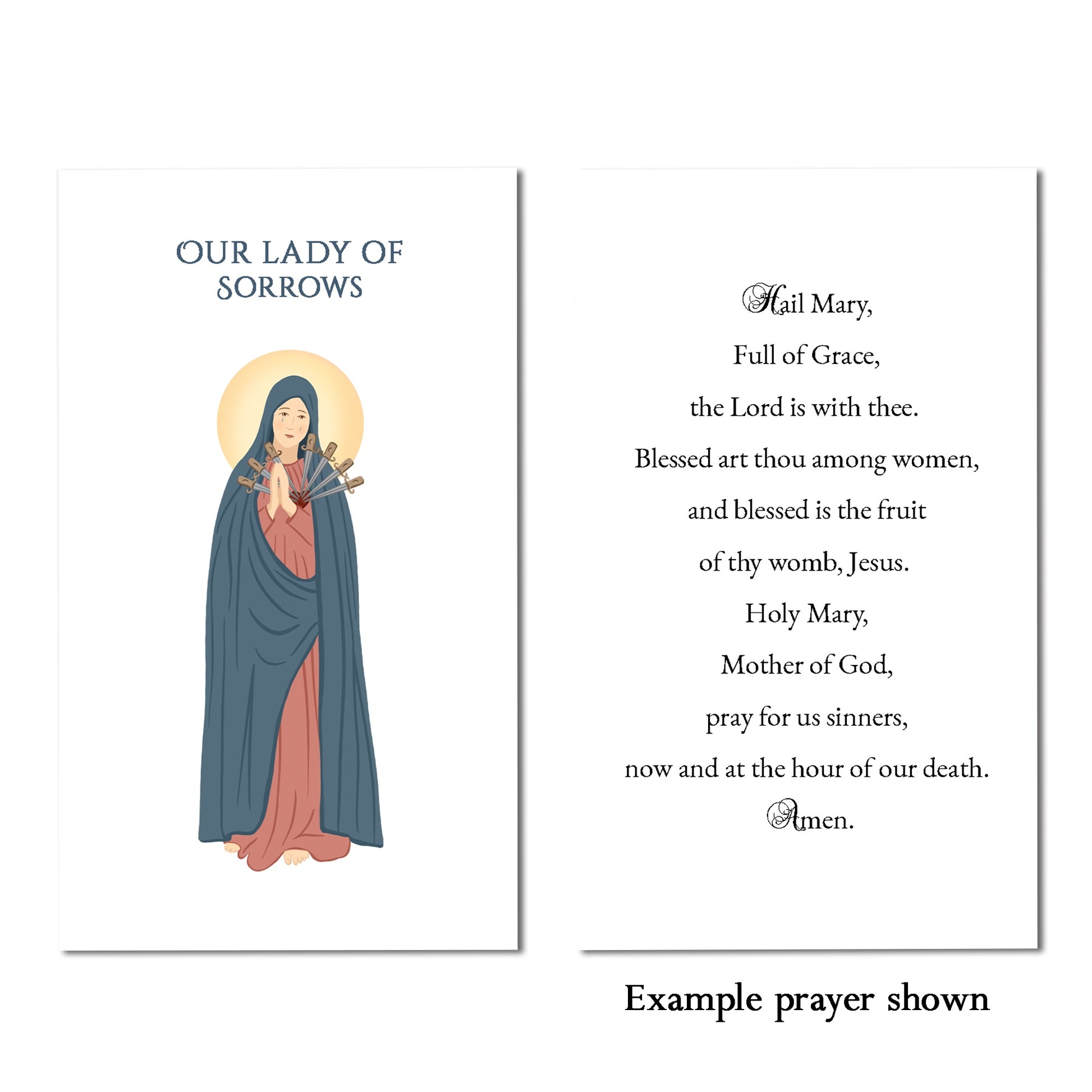 This charming prayer card feature the cherished design of Our Lady of Sorrows. The gorgeous colors and fine detail are a great tool in prayer as you lift your heart and mind towards Heaven. This prayer card encourages devotion towards Our Blessed Mother as our greatest intercessor in Heaven. She is a loving Mother who so desires her children to stay on the path to sanctity, encouraging and comforting them along the way. Get this prayer card personalized by choosing which prayer you would like on the back of them. This prayer card is a great small devotional item to hand out at Church, parish groups, and classrooms.