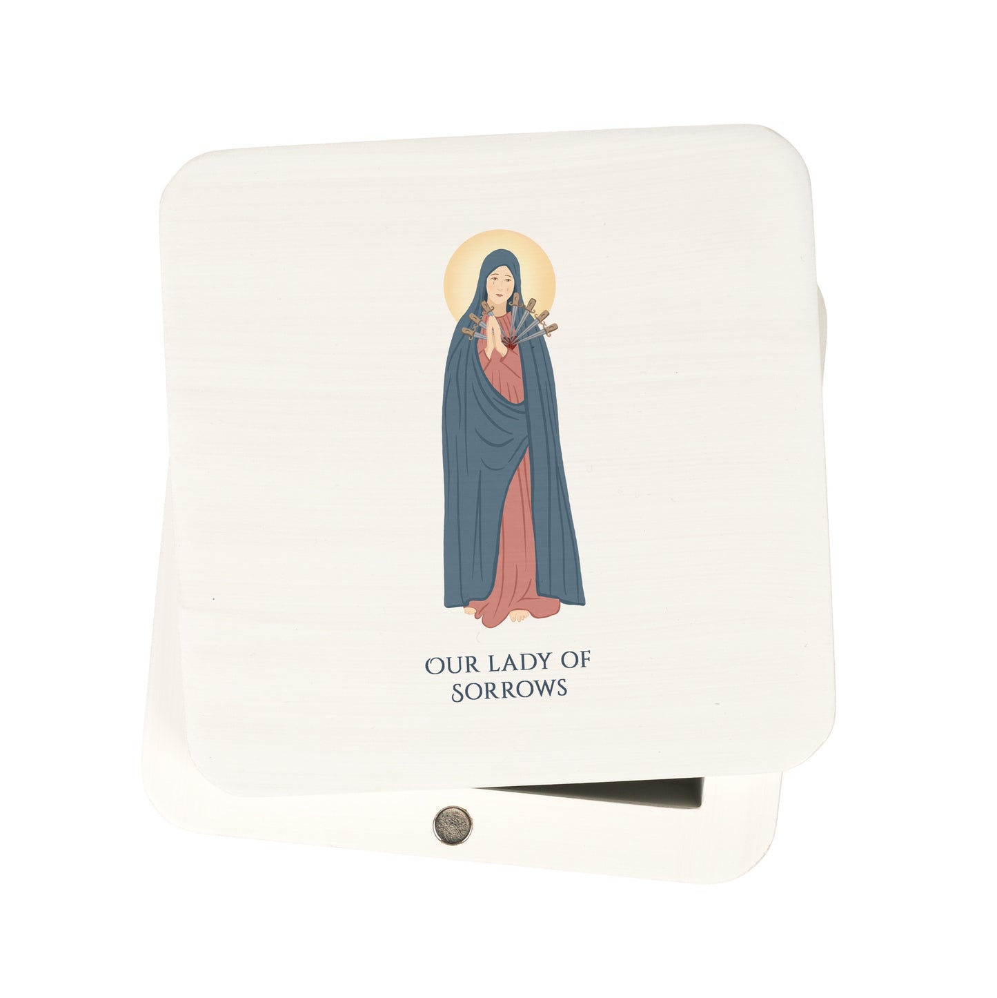 This lovely white matte wooden keepsake box is simply elegant and incredibly meaningful. The magnetic lid safeguards a rosary, jewelry, or other small items of special value. This box beautifully depicts Our Lady of Sorrows. This distinctive and stylish piece is a practical, faithful, and encouraging piece that reminds us that Mary is always with us and does not take her role as Mother lightly. She desires to see us rise up and face our challenges as she faithfully encourages and comforts us. The sorrow on Mary's countenance is reflective of the anguish her heart underwent during the Passion and Crucifixion of her Son. This keepsake box is a special gift for a woman who is tasting some of this anguish and enduring trials of her own.
