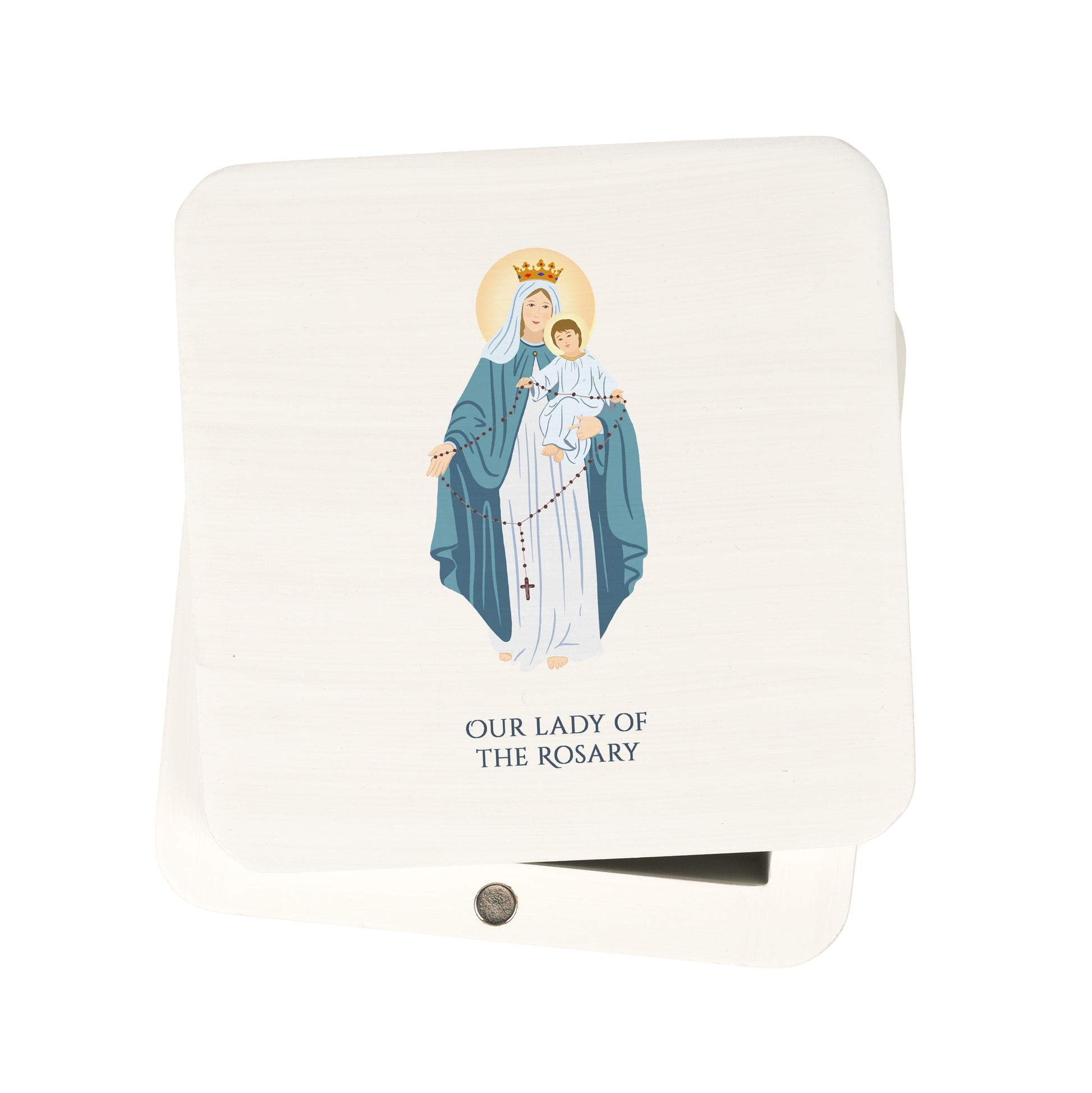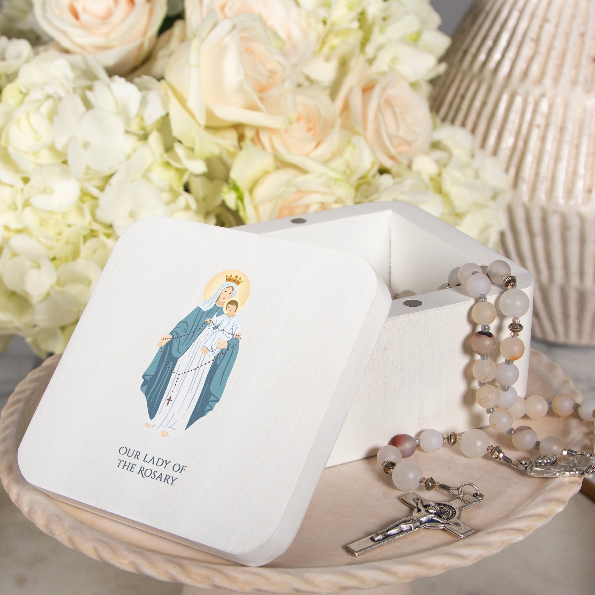 This lovely white matte wooden keepsake box is simply elegant and incredibly meaningful. The magnetic lid safeguards a rosary, jewelry, or other small items of special value. This box beautifully depicts Our Lady of the Rosary. This distinctive and stylish piece is a practical, faithful, and encouraging piece that reminds us that Mary is always with us and does not take her role as Mother lightly. She desires to see us rise up and face our challenges as she faithfully encourages and comforts us. This magnetic box is a great gift idea to anyone receiving a sacrament or has a devotion to Our Lady of the Rosary.