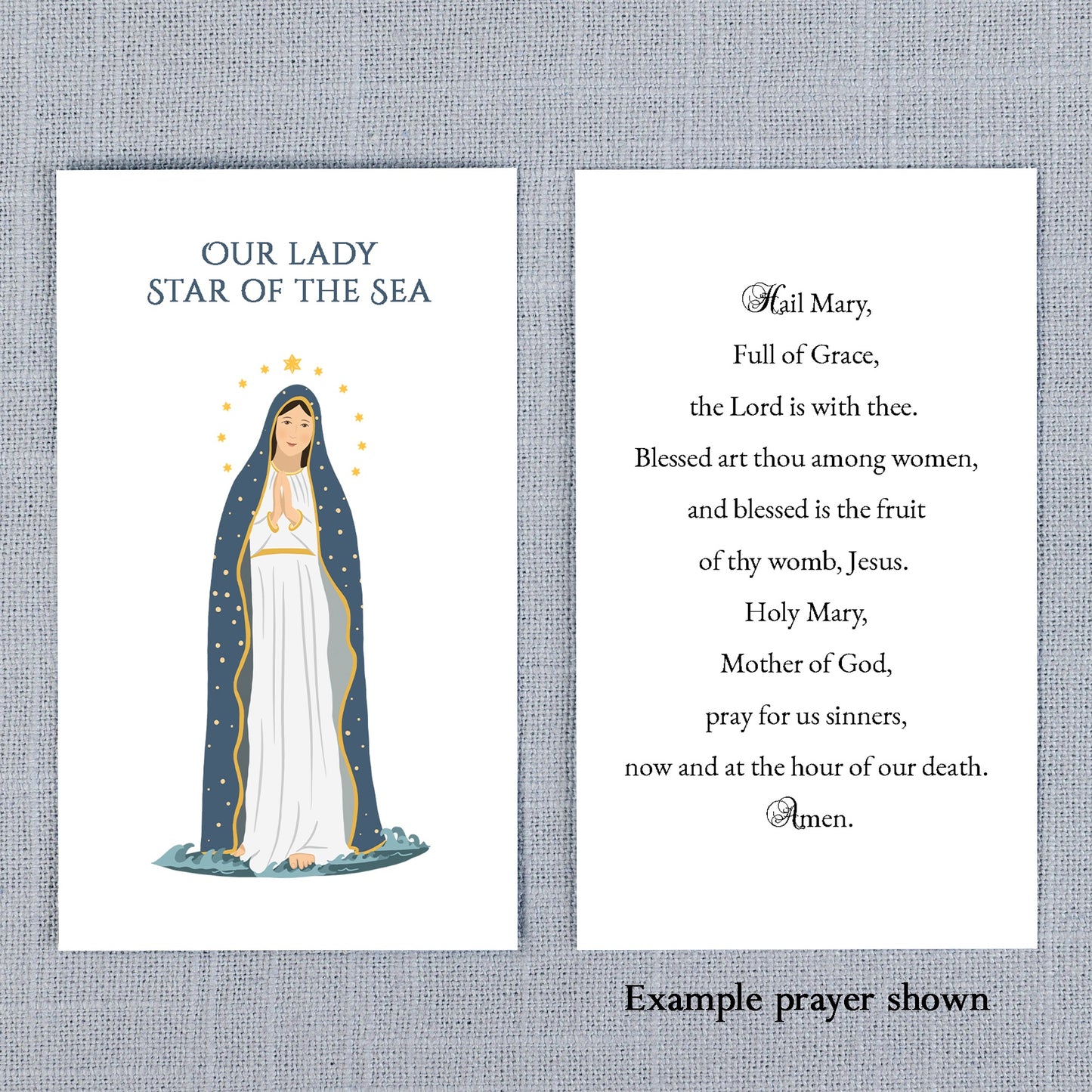 This charming prayer card feature the cherished design of Our Lady Star of the Sea, Stella Maris. The gorgeous colors and fine detail are a great tool in prayer as you lift your heart and mind towards Heaven. This prayer card encourages devotion towards Our Blessed Mother as our greatest intercessor in Heaven. She is a loving Mother who so desires her children to stay on the path to sanctity, encouraging and comforting them along the way. Get this prayer card personalized by choosing which prayer you would like on the back of them. This prayer card is a great small devotional item to hand out at Church, parish groups, and classrooms.
