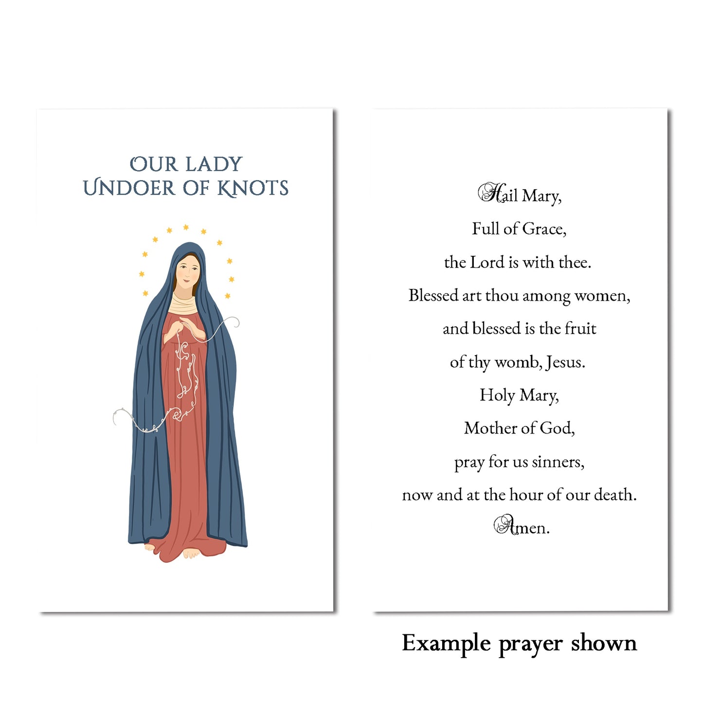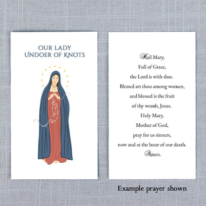 This charming prayer card feature the cherished design of Our Lady Undoer of Knots. The gorgeous colors and fine detail are a great tool in prayer as you lift your heart and mind towards Heaven. This prayer card encourages devotion towards Our Blessed Mother as our greatest intercessor in Heaven. She is a loving Mother who so desires her children to stay on the path to sanctity, encouraging and comforting them along the way. Get this prayer card personalized by choosing which prayer you would like on the back of them. This prayer card is a great small devotional item to hand out at Church, parish groups, and classrooms.