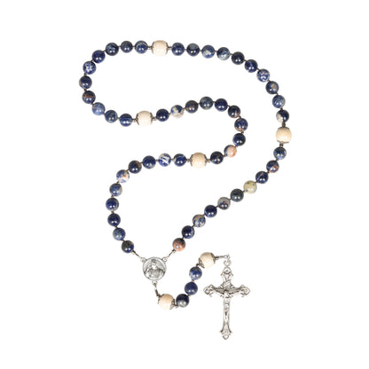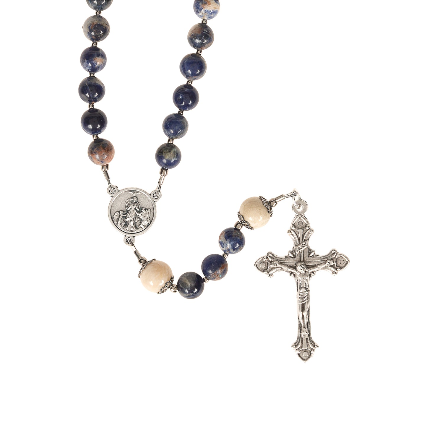 In the famous painting of Our Lady Undoer of Knots, Mary is shown in prayer as she lovingly unties the knots of confusion and discord in our lives. The beautiful blues, tans, and golden orange highlights found on the gorgeous Sodalite Hail Mary beads call to mind the colors in the famous painting, and the colors of both earth and heaven, symbolizing Our Lady's queenship over all earthly and spiritual realities. The pure Riverstone Our Father beads with discrete swirls symbolize Our Lady's desire to accompany her children in purity and love while untying the knots in our lives.