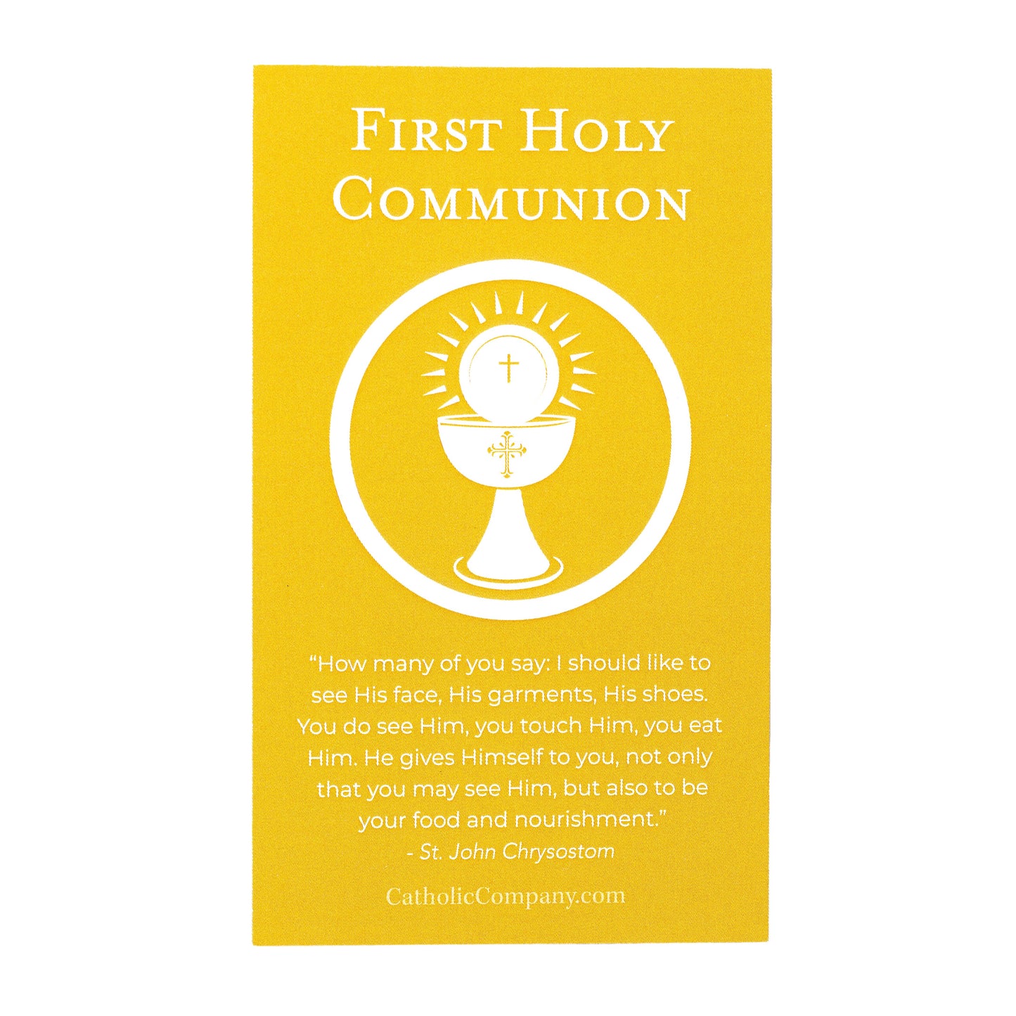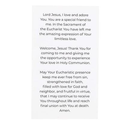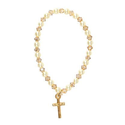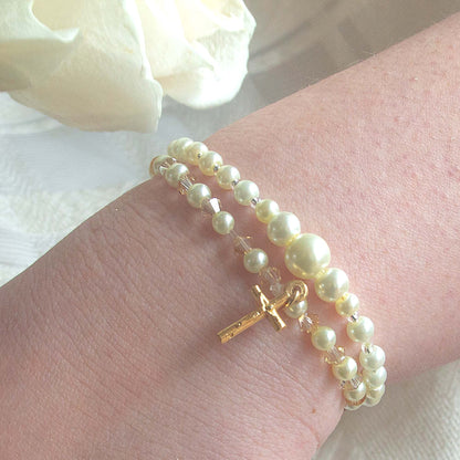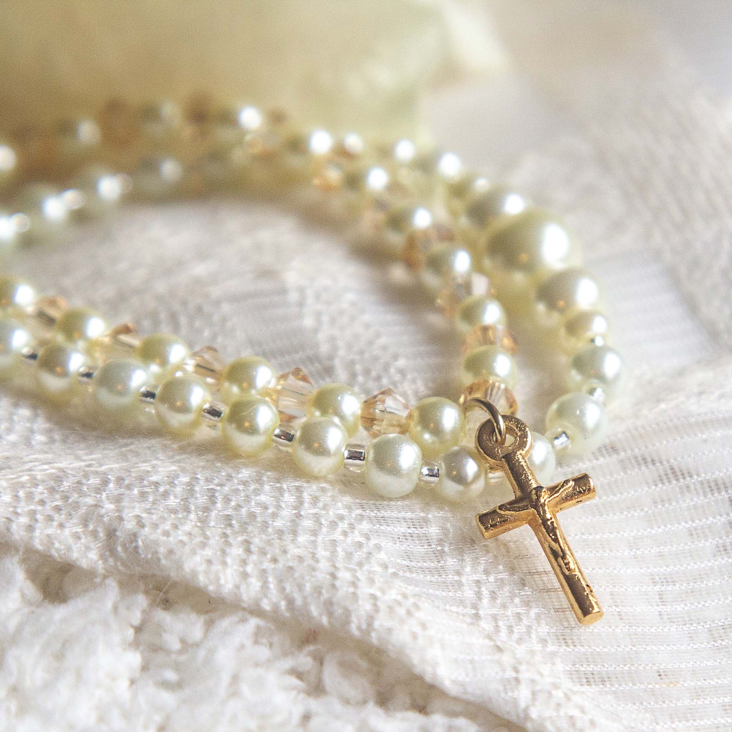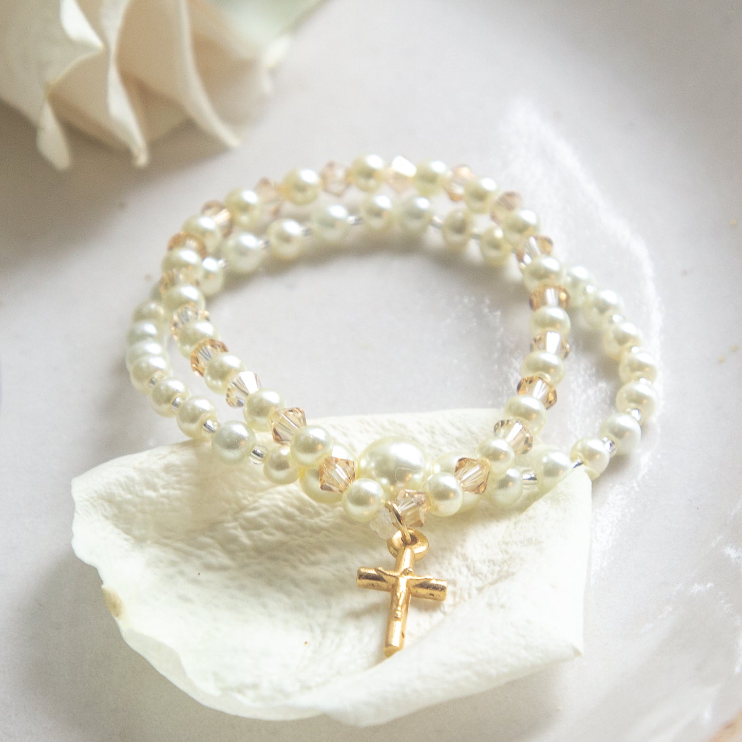 This bracelet set is sure to become her favorite. The two bracelets coordinate for a look that is just charming. One features creamy ivory pearlized beads, clear round seed bead spacers, and a center of three larger pearls to represent the Most Holy Trinity dwelling within her. The second bracelet features the same lovely pearled beads with distinctive cone-shaped Czech crystals in palest gold to highlight the centerpiece of the bracelet, a petite golden Crucifix charm. The bracelets are tied together with an ivory satin ribbon, and come safely tucked inside a small burlap gift bag. Give her a special keepsake of her First Communion day and a charming gift that is sure to please. Includes First Communion Prayer Card with a lovely children's prayer.