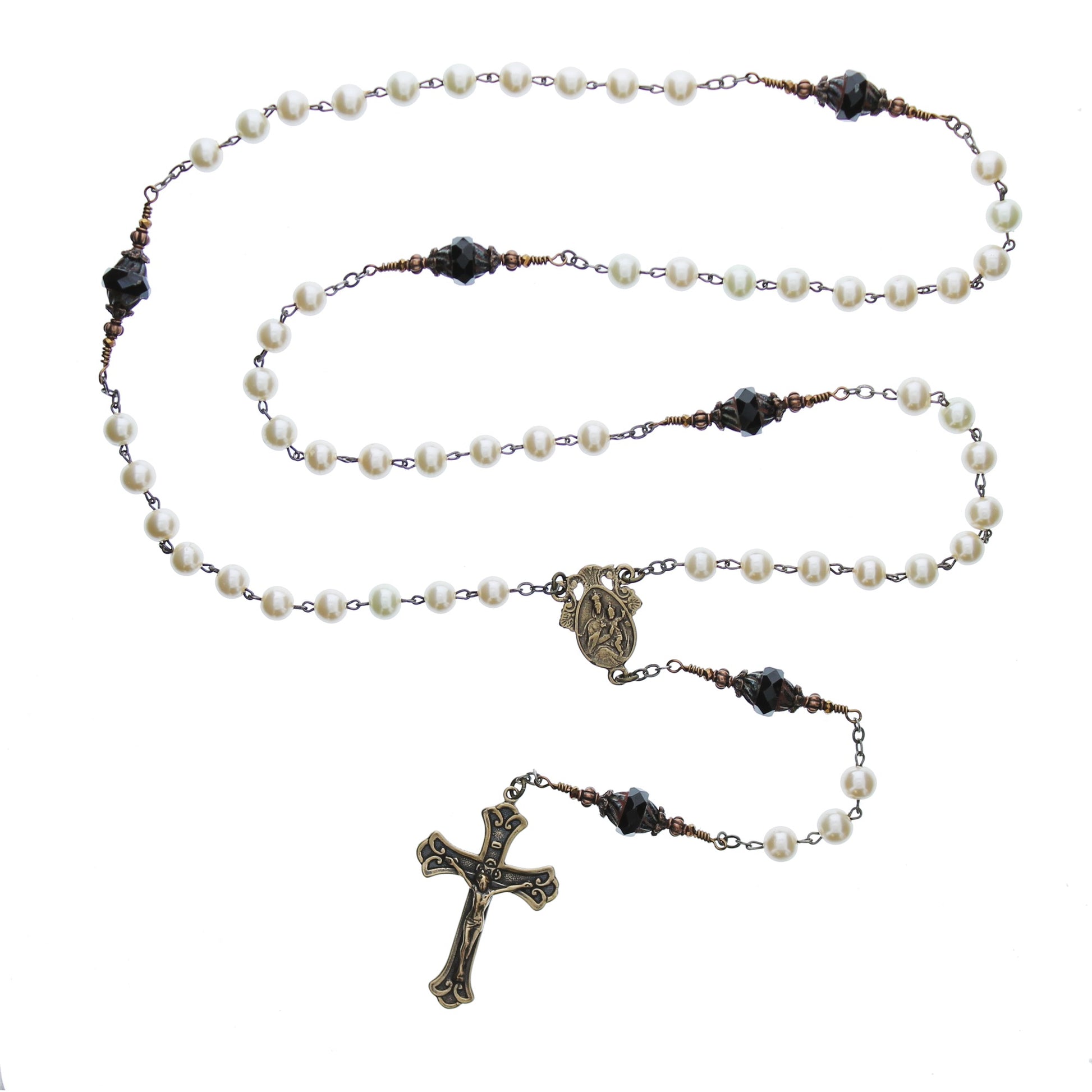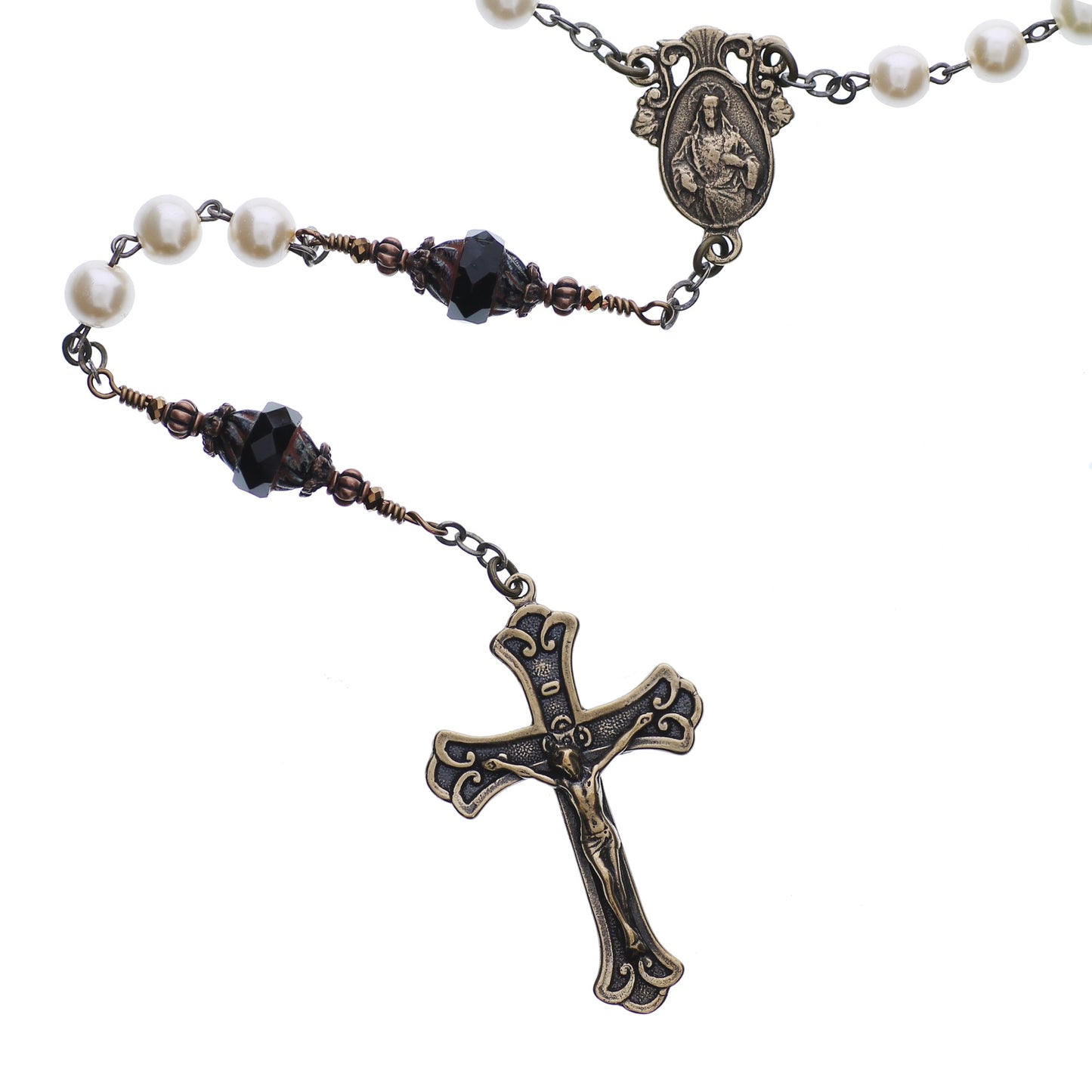 Classic pearl beads are paired with black Our Father beads for a graceful mix in this gorgeous rosary. The centerpiece of this unique rosary is the ornate bronze Sacred Heart of Jesus. Meditate on the truths of the Faith while uniting your heart and mind with Jesus and Our Lady or give this gorgeous rosary as a gift to a loved one for a special occasion.