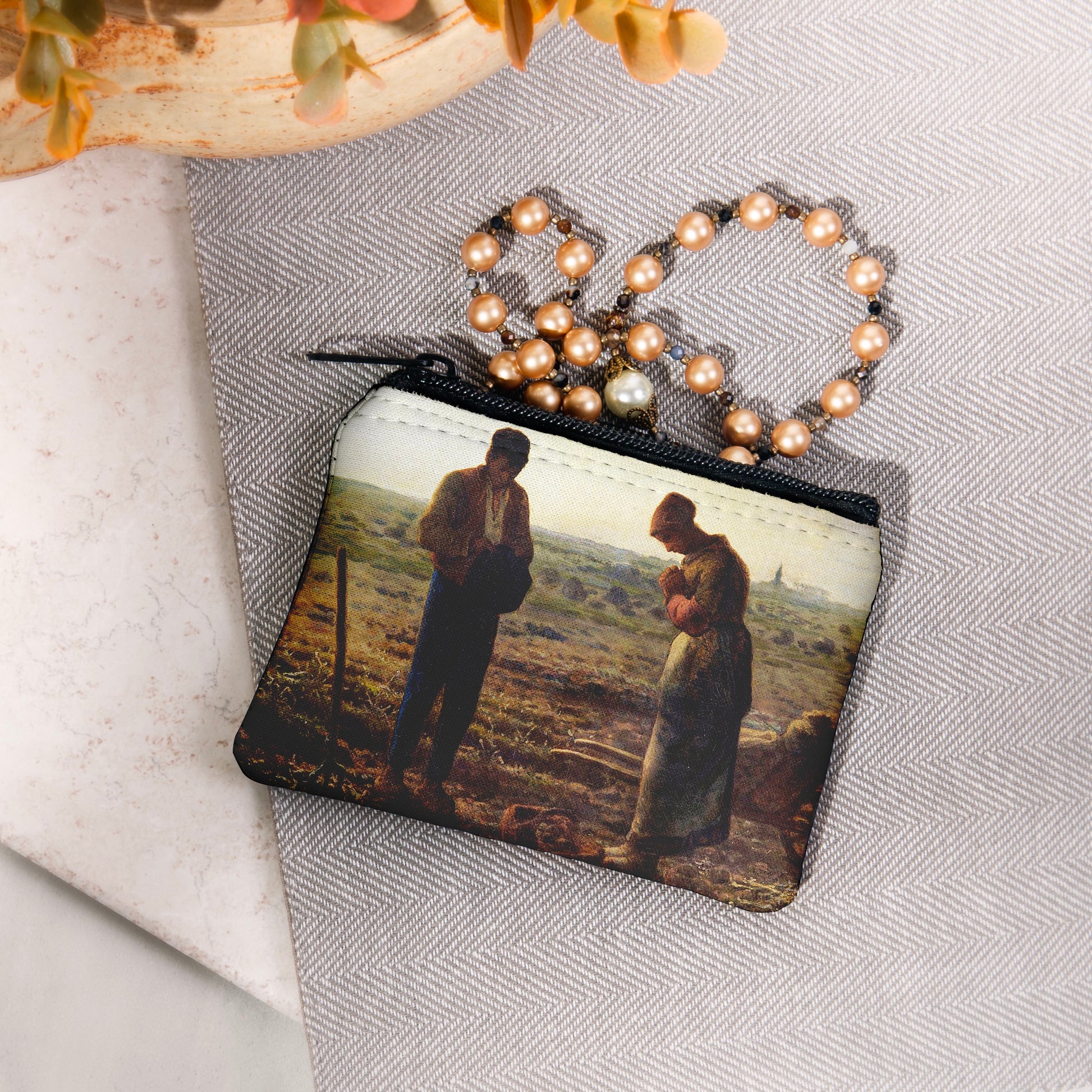 This zippered pouch provides a fantastic way to keep your rosary beads close at hand wherever you go. With free personalization on the reverse, it displays a touching image of a young man and woman pausing from their daily work to pray the Angelus. This image tenderly draws you into the special moment shared between this young couple as they stop to pray. The perfect reminder to never forget our Creator even during the busy hours of the day.