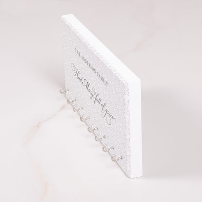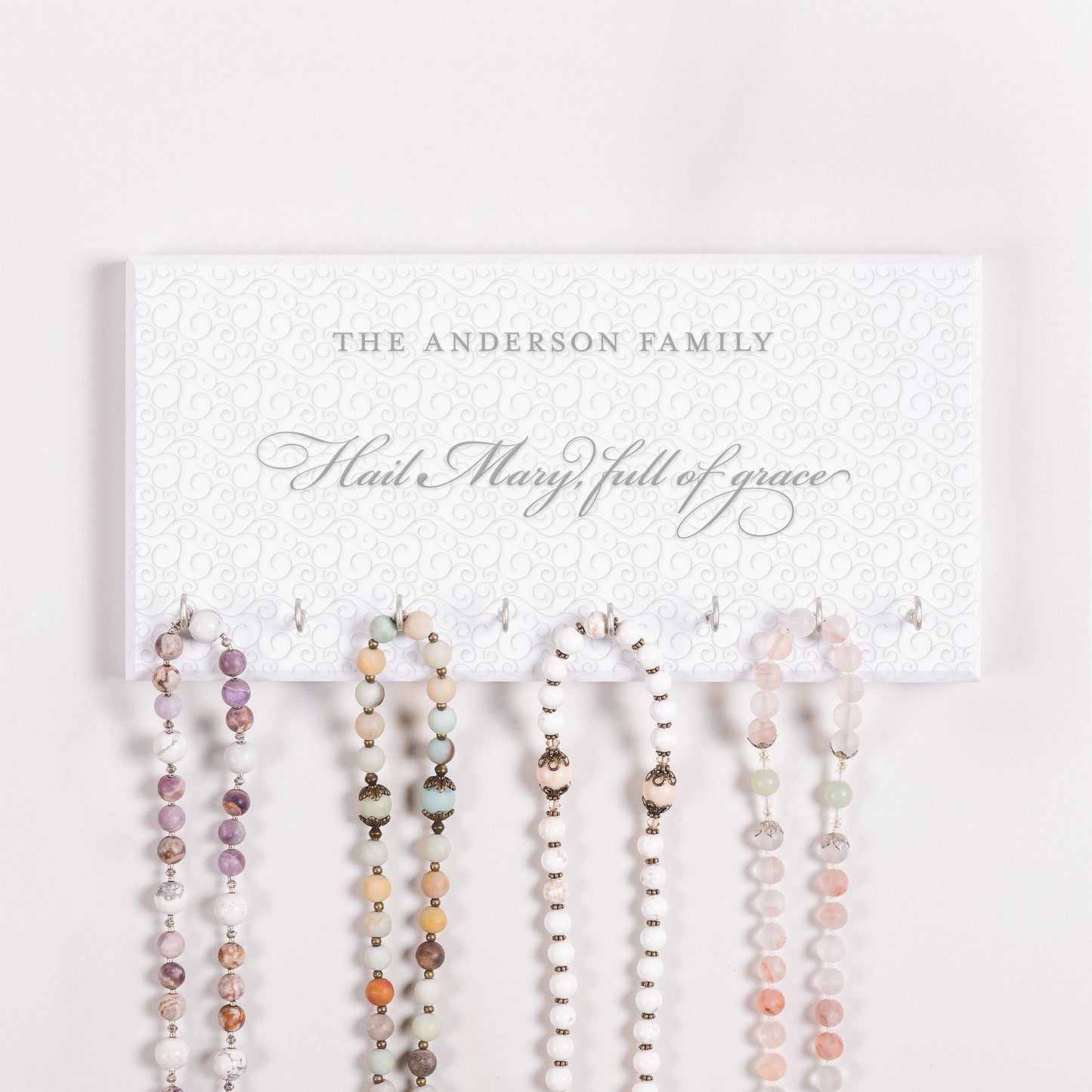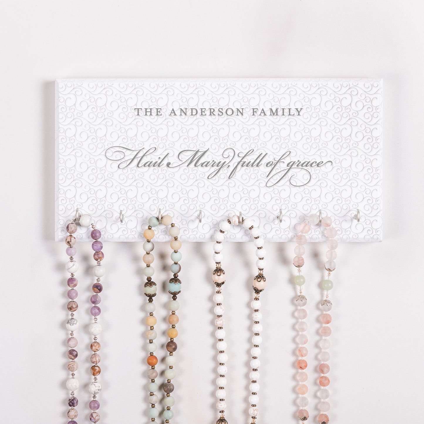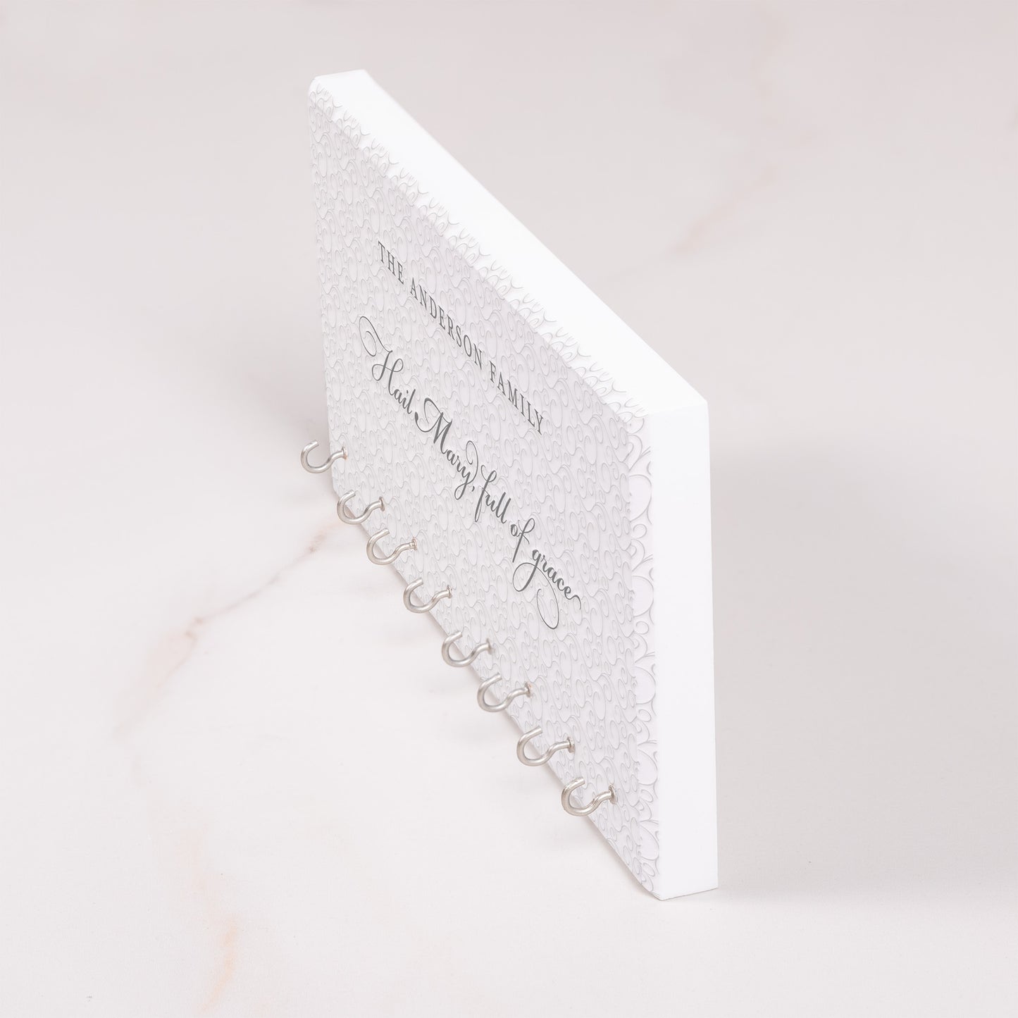 The white wooden rosary rack features a subtle and beautiful swirled background. Hail Mary, Full of Grace is scripted in deep gray below your family name (The _____ Family).