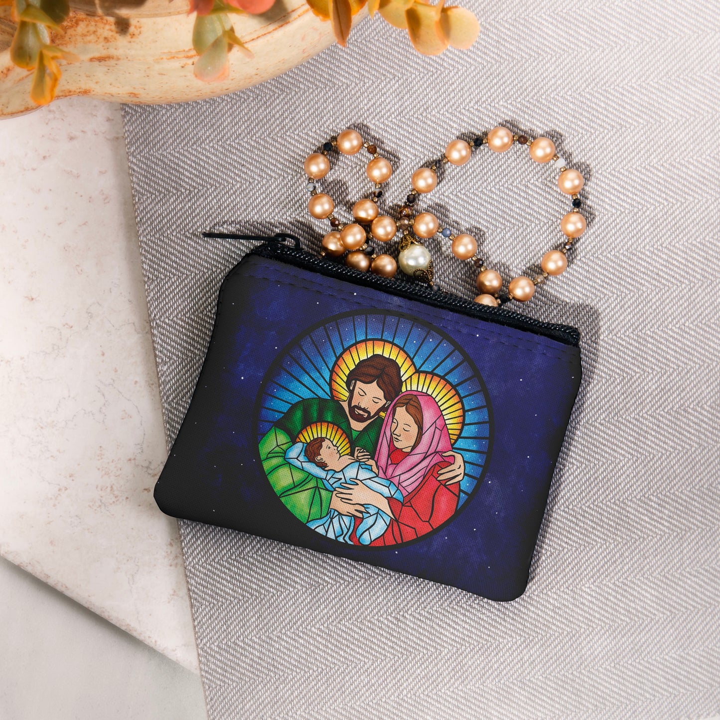 This charming rosary pouch beautifully displays a unique stained-glass rendition of the Holy Family on Christmas night. Beseech the Holy Family to bless your family and all the extended members. Rosary pouches protect your rosary beads and keep them on hand whenever you need them, and this exclusive case is the perfect size to fit in your pocket, purse, or backpack!