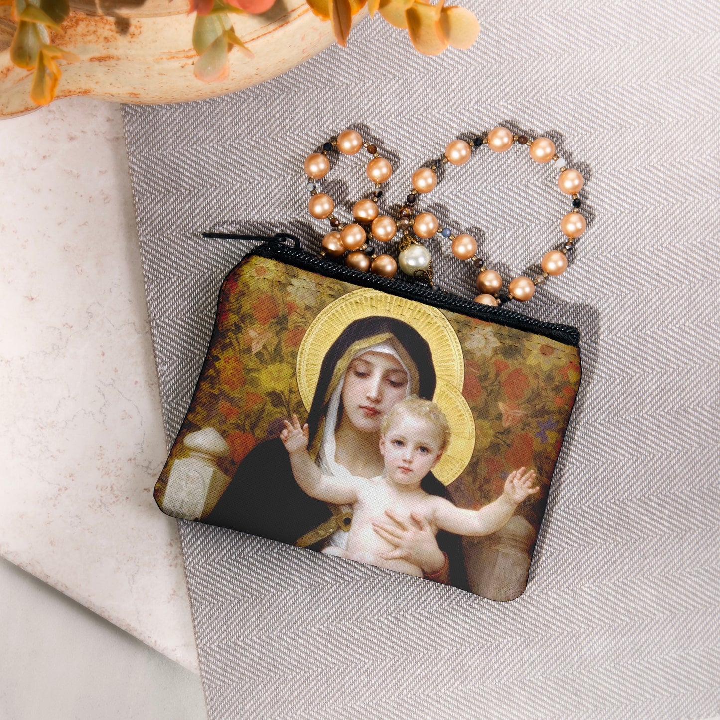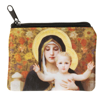 Remember the love and affection of the Blessed Mother whenever you use this rosary pouch. Mary is portrayed as the loving Madonna of the Lilies as she tenderly supports Christ who is stretching out His arms in blessing and love. With a secure zipper enclosure that fits snugly in your purse or backpack, it features free personalization of your initials or monogram on the reverse, making it a unique gift for any occasion.