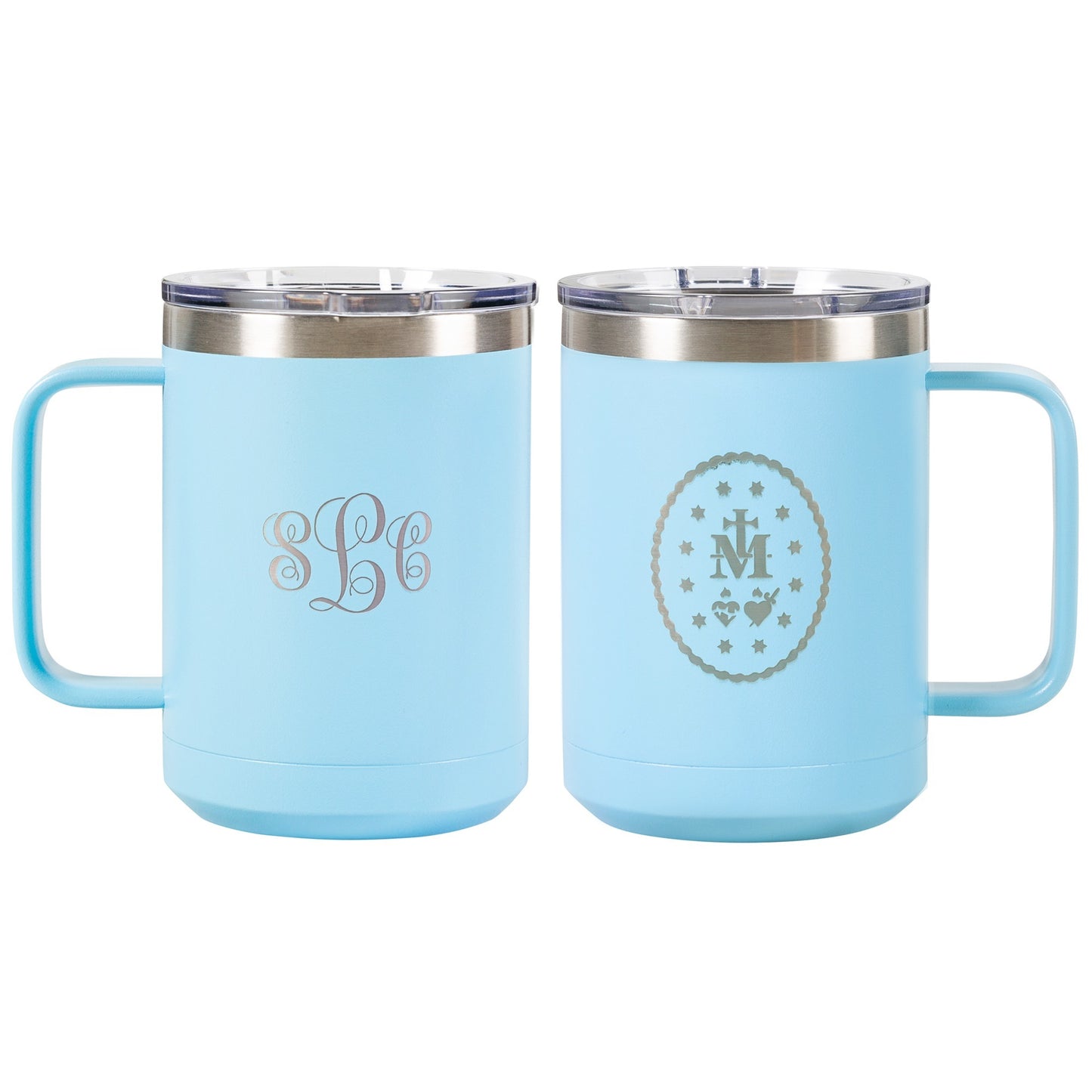 Express your devotion to the Blessed Mother by featuring her beloved Miraculous Medal on your favorite mug. This vibrant blue insulated travel mug showcases the reverse side of the medal, just as Our Lady gave it to St. Catherine Labouré in 1830.