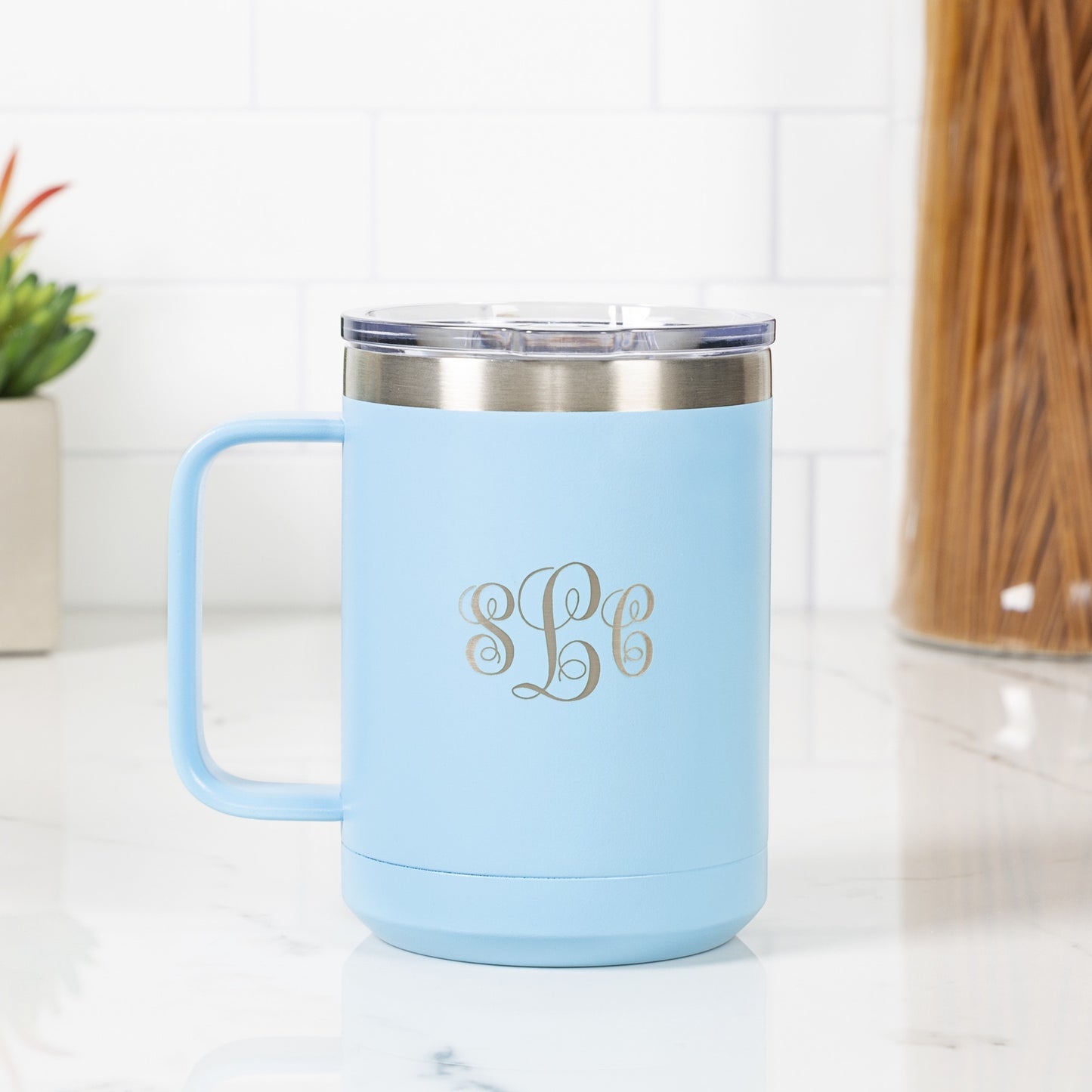 - Insulated light blue travel coffee tumbler