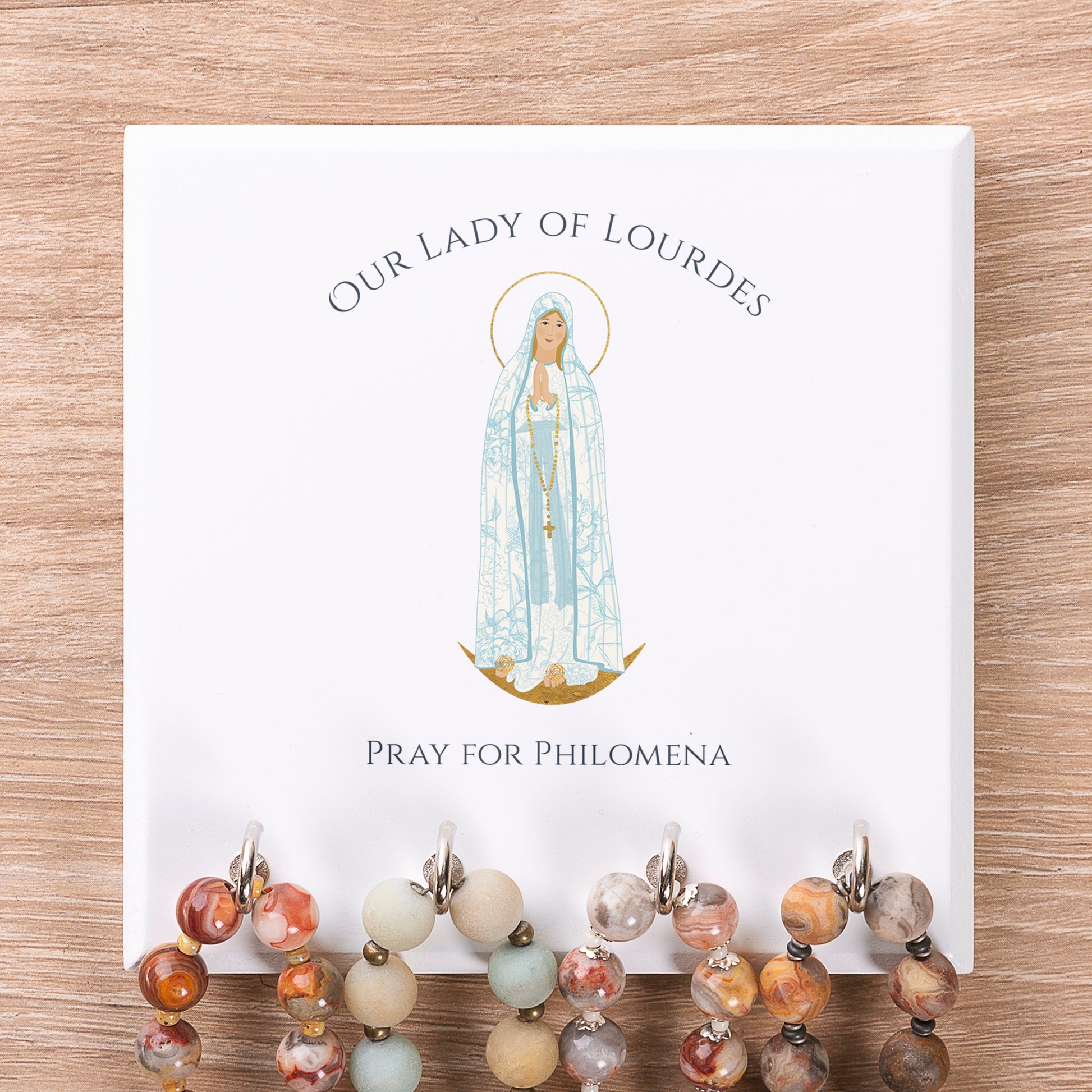 Beneath Our Lady's feet, your personalized message appears in graceful matching script. It's a faithful, personal, and practical gift that turns hearts and minds to Our Lady and honors her holy rosary. A perfect Housewarming or Wedding gift, and a wonderful accessory for your own home.