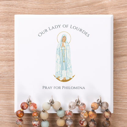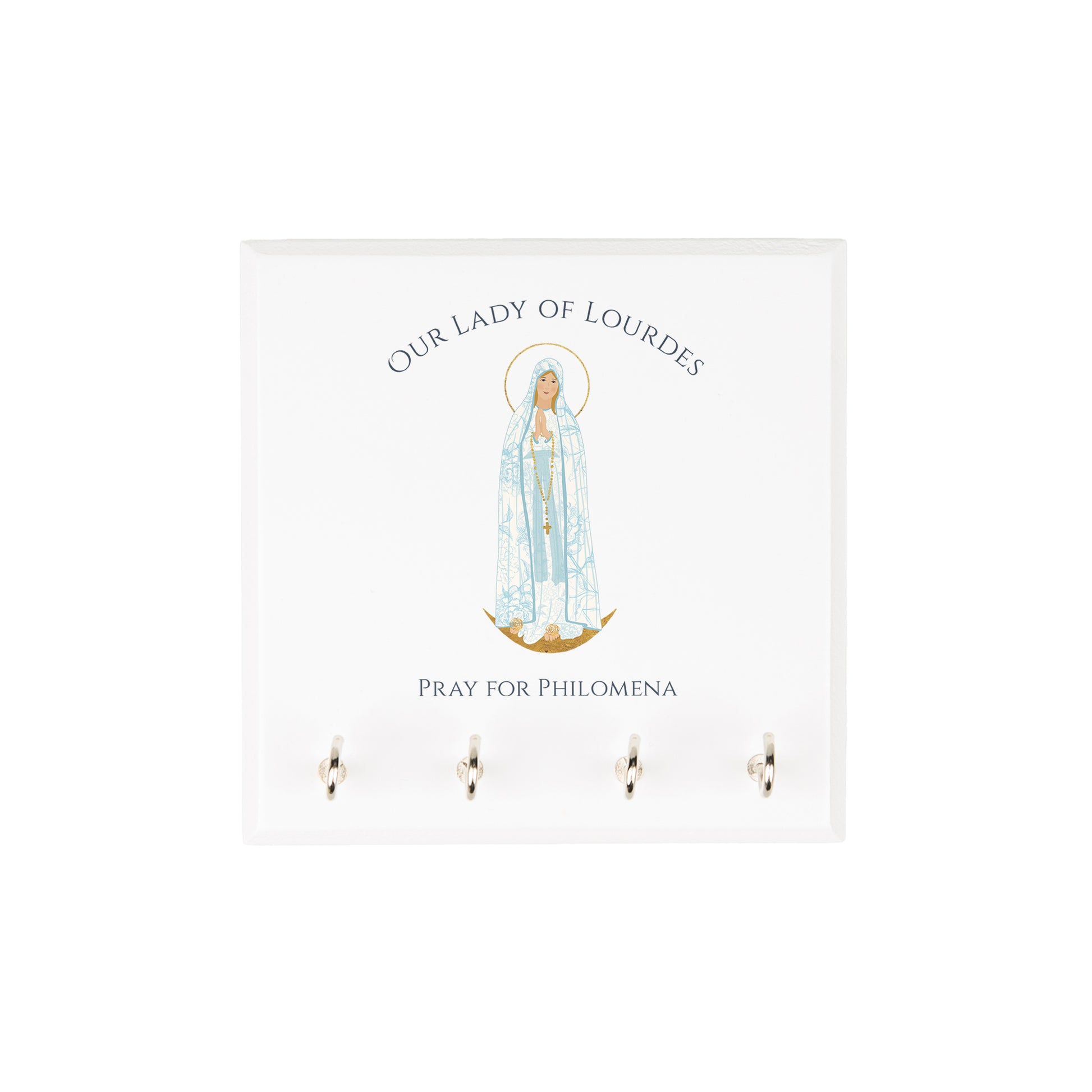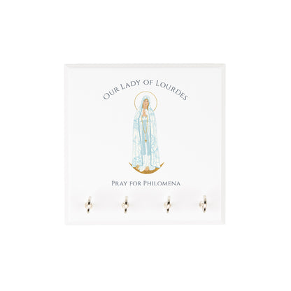 From our exclusive and charming Marian Collection, a sturdy wooden rosary rack to keep your family grounded in prayer, and keep your rosaries close at hand. With our own serene and lovely colored image of Our Lady of Lourdes above the 4 silver hooks, it's a reminder of Mary's motherly love and protection, and a useful gift for any Catholic home.