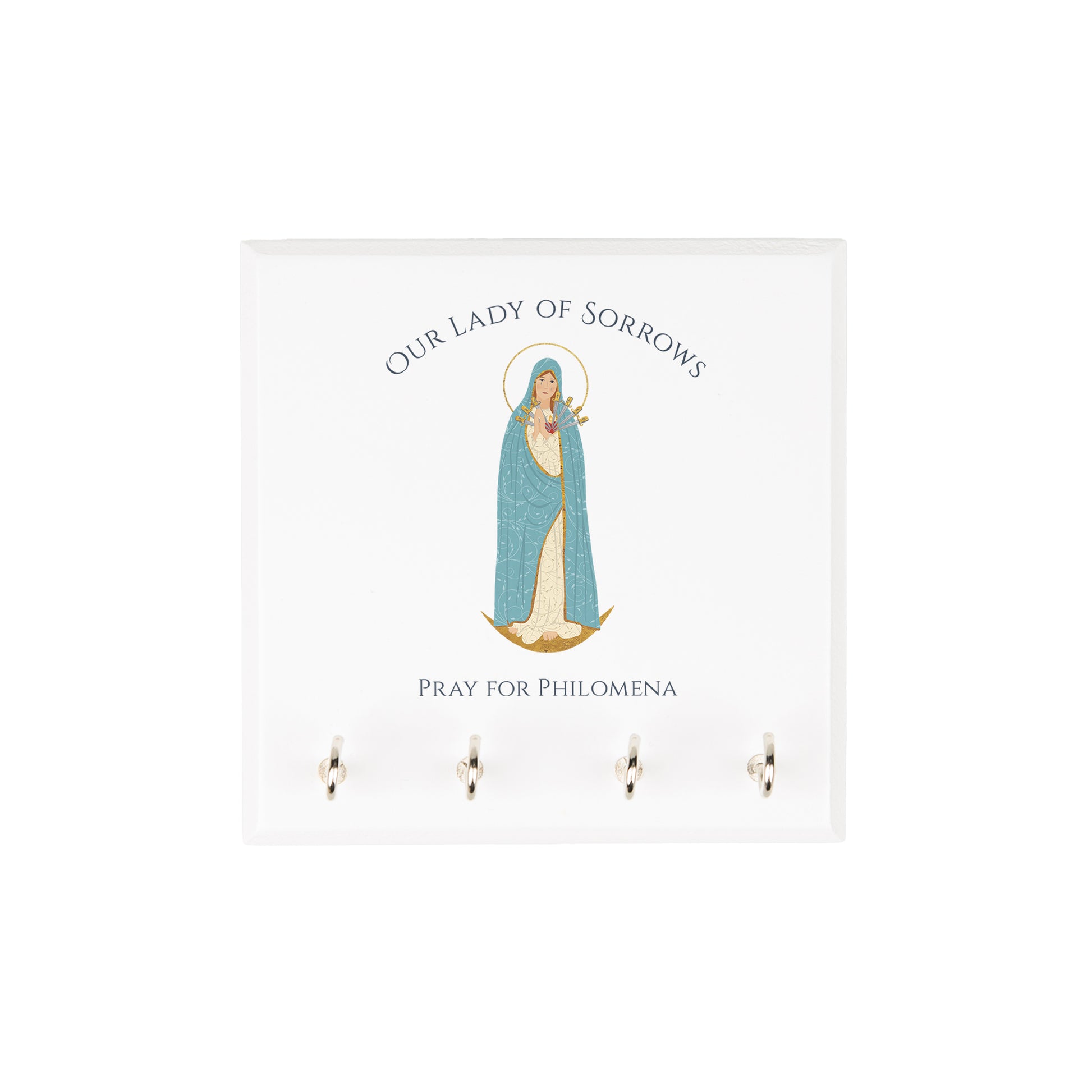 From our exclusive and charming Marian Collection, a sturdy wooden rosary rack to keep your family grounded in prayer, and keep your rosaries close at hand. With our own serene and lovely colored image of Our Lady of Sorrows above the 4 silver hooks, it's a reminder of Mary's motherly love and protection, and a useful gift for any Catholic home.