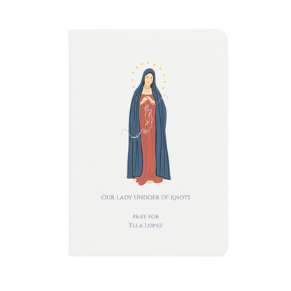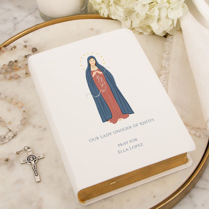 Show your faith and devotion to Mary with this lovely, softcover faux leather bible in pristine white, featuring Our Lady Undoer of Knots on the cover. Ask her protection and blessing over you or someone you cherish by giving it as a distinctive gift. Mary's image is sweet and serene as she unties the knots in the lives of her children, symbolizing her desire to intercede for us in all things. At her feet, her title and a personalized blessing invoke her prayers.