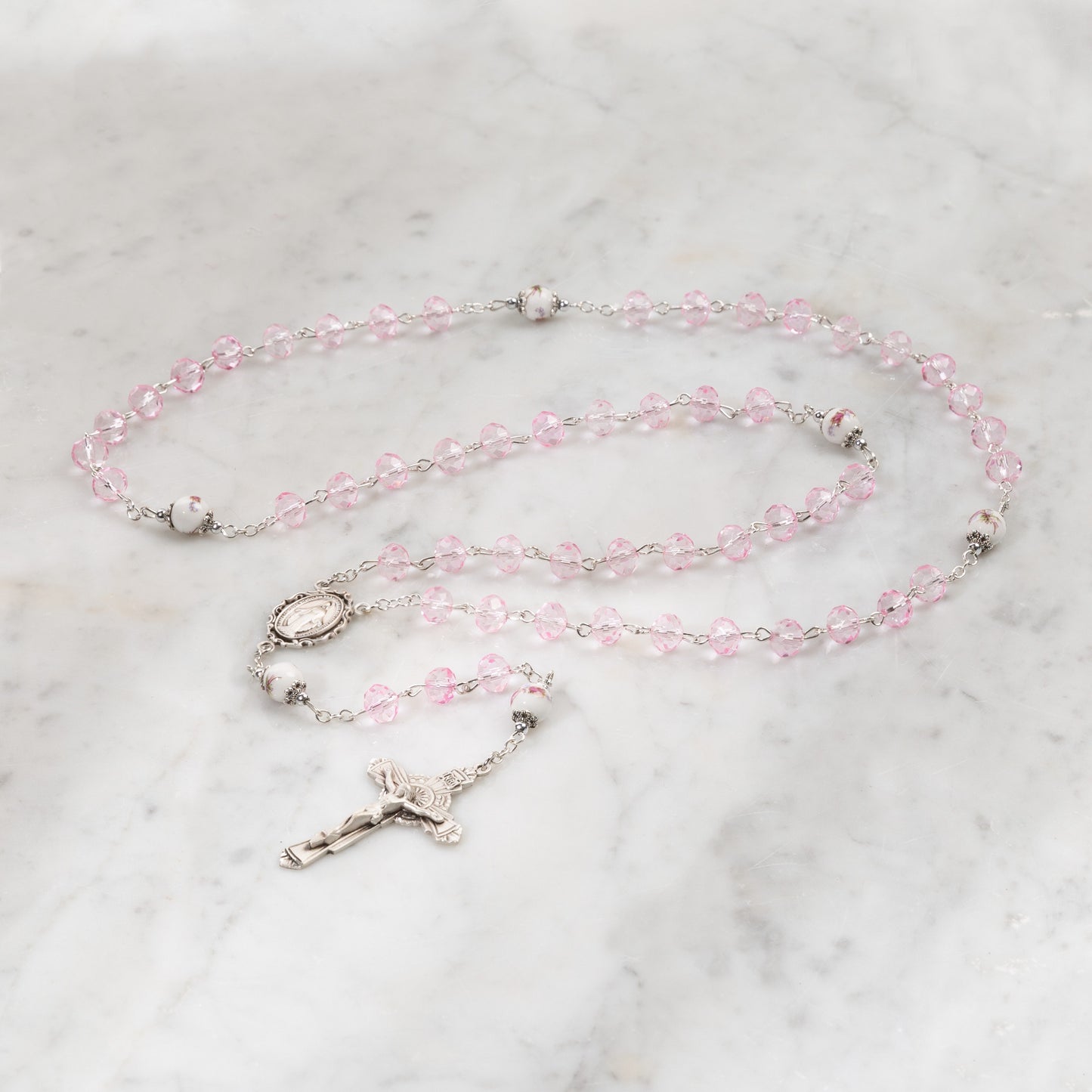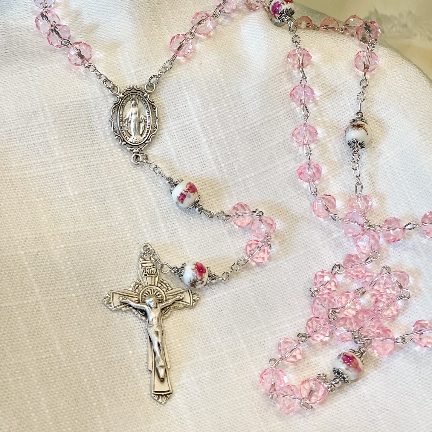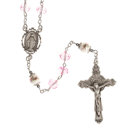 This gorgeous and feminine rosary features serene, petal pink sun-cut crystal beads that sparkle luminously for the Hail Marys, and white, ceramic beads with delicately painted pink roses for the Our Fathers. The Our Father beads are flanked with ornate caps, adding additional elegance. The sterling silver accents highlight the pink beading and graceful, feminine touch. The Miraculous Medal centerpiece is ornately framed in a cutout style, finely detailed and plated in rhodium for luster and durability, and the oxidized silver sunburst Crucifix is distinctive and beautiful. Gift boxed for presentation.
