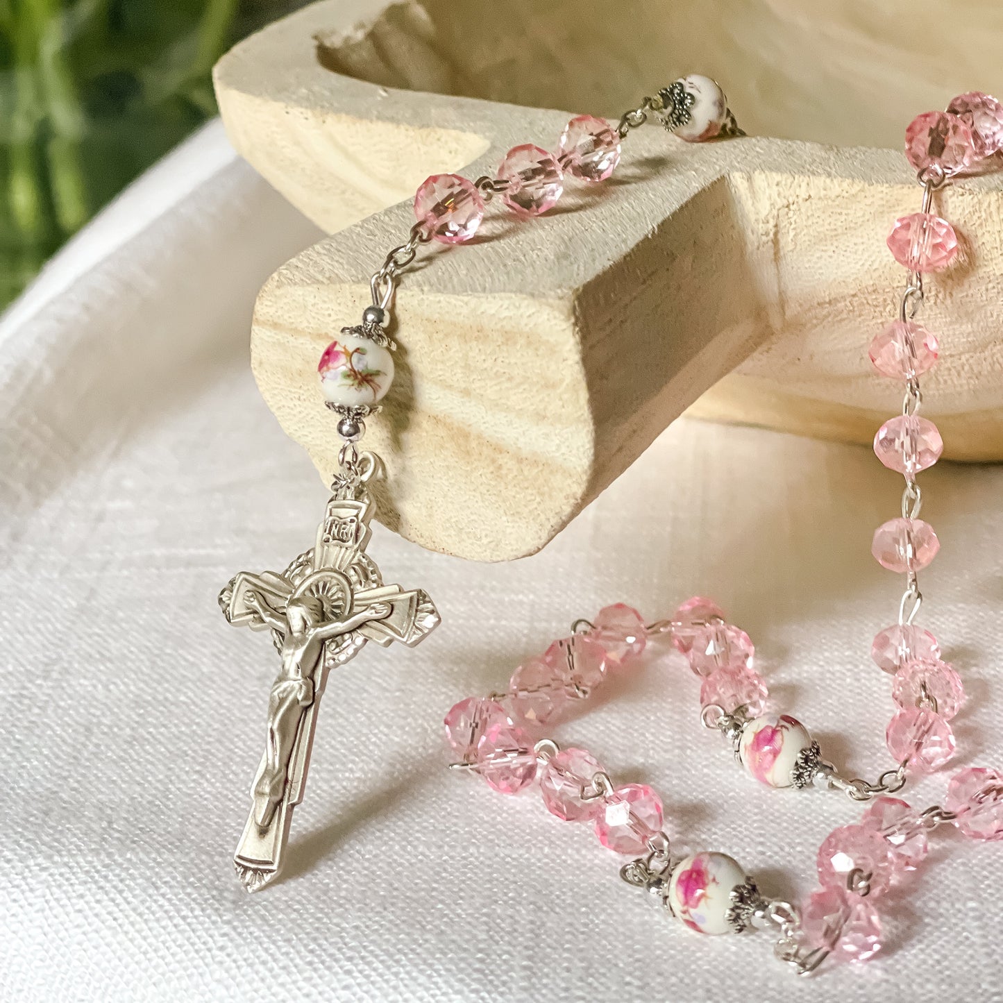 - Pale pink crystal and floral ceramic beading