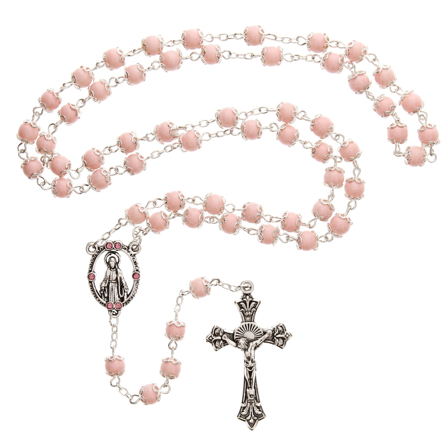 The pink glass beads of this rosary remind you of the feminine virtues so beautifully exemplified by the Blessed Mother, and the Miraculous image centerpiece is embedded with dainty pink stones. The ornate crucifix perfectly complements the light pink of the beads, making this a lovely rosary that will be cherished by a Catholic lady of any age.