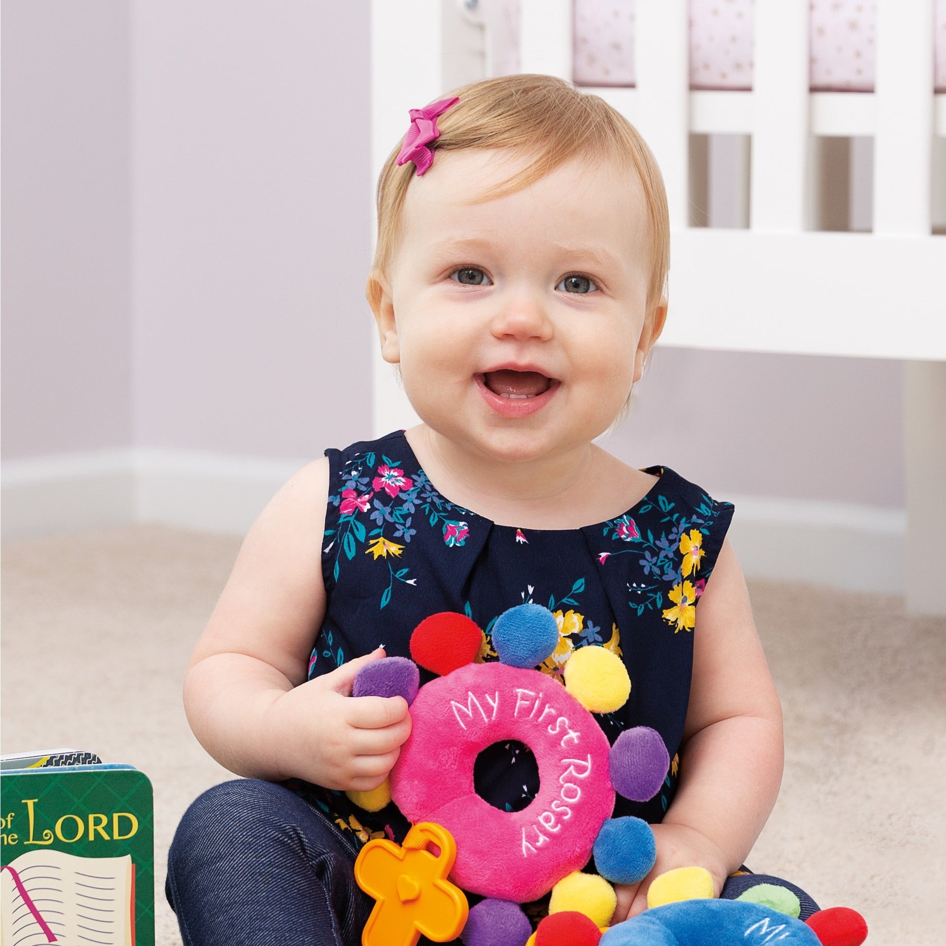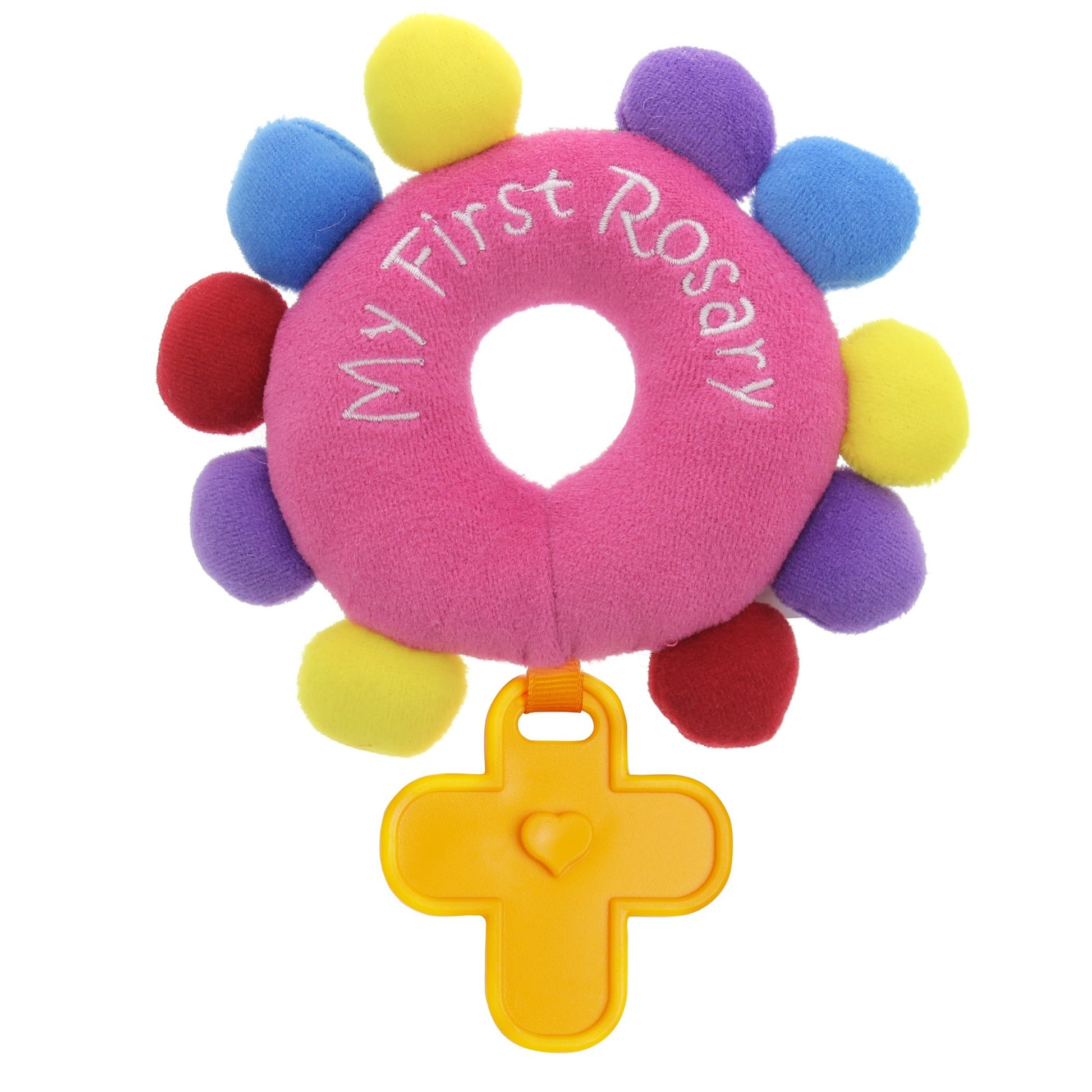 This plush baby rosary is safe and non toxic for ages newborn and up.