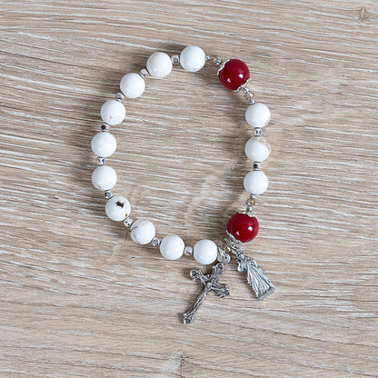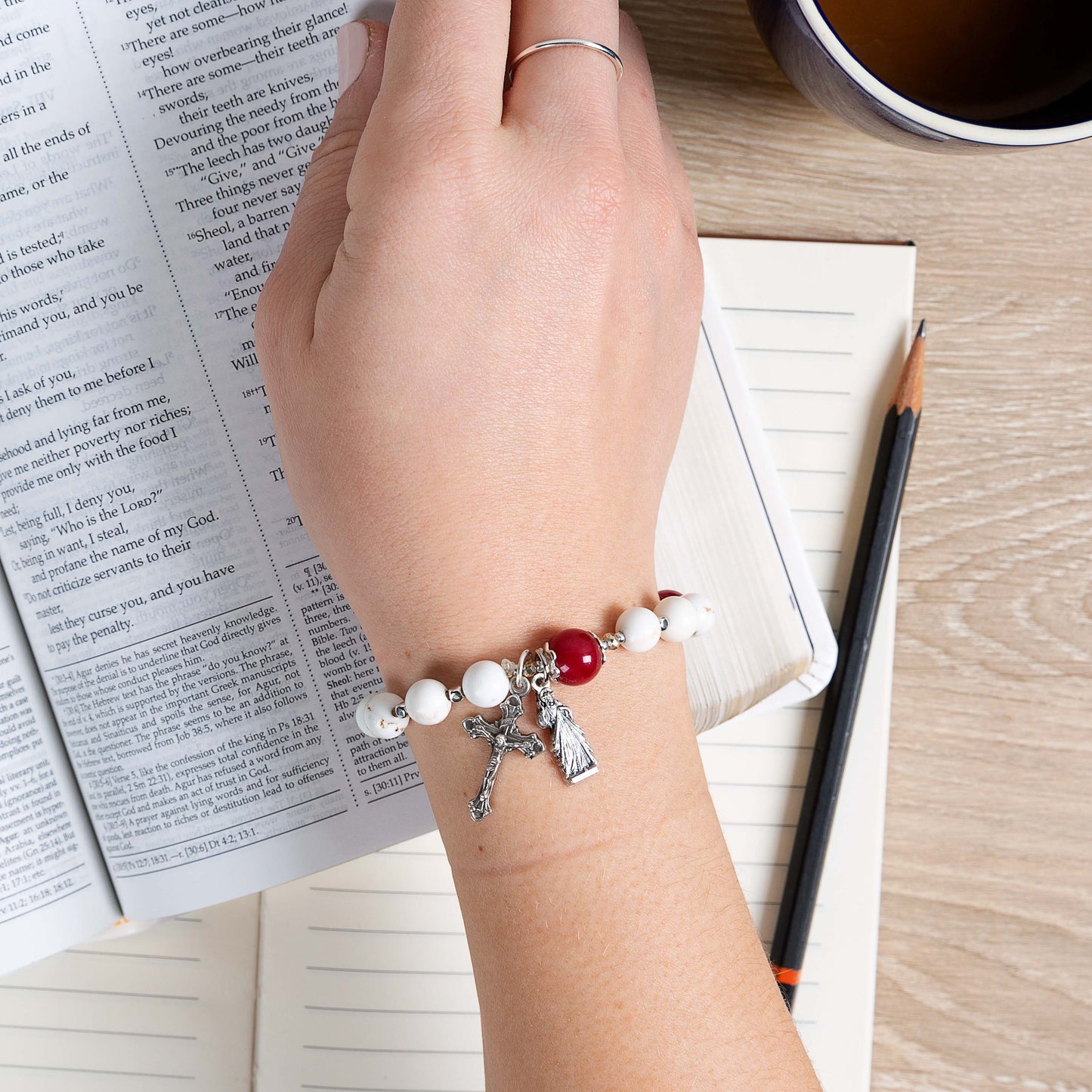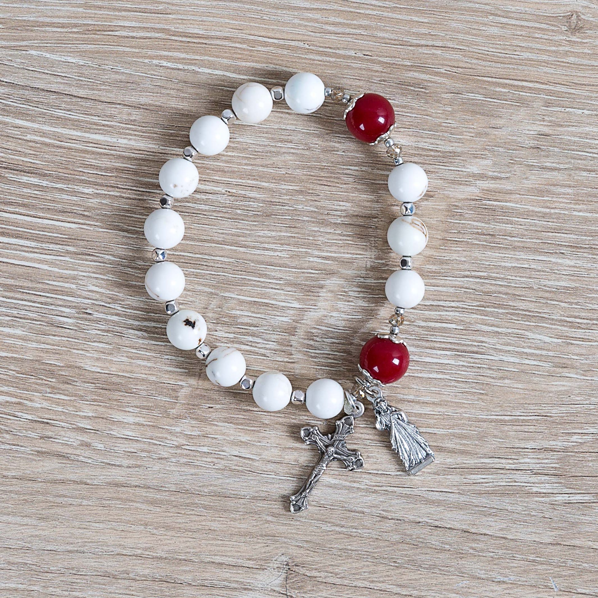 In honor and gratitude for the gift of the blood and water of Divine Mercy, we present this elegant and symbolic Red Jade & Magnesite Divine Mercy Rosary Bracelet. As you pray the Chaplet or Rosary, rich and gorgeous Red Jade gemstone rounds flanked by silver plated floral caps mark the Eternal Father/Our Father prayer beads. Pray the "Oh, Blood and Water..." / Hail Mary prayers on creamy white-grey Magnesite beads variegated for movement and depth.