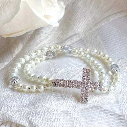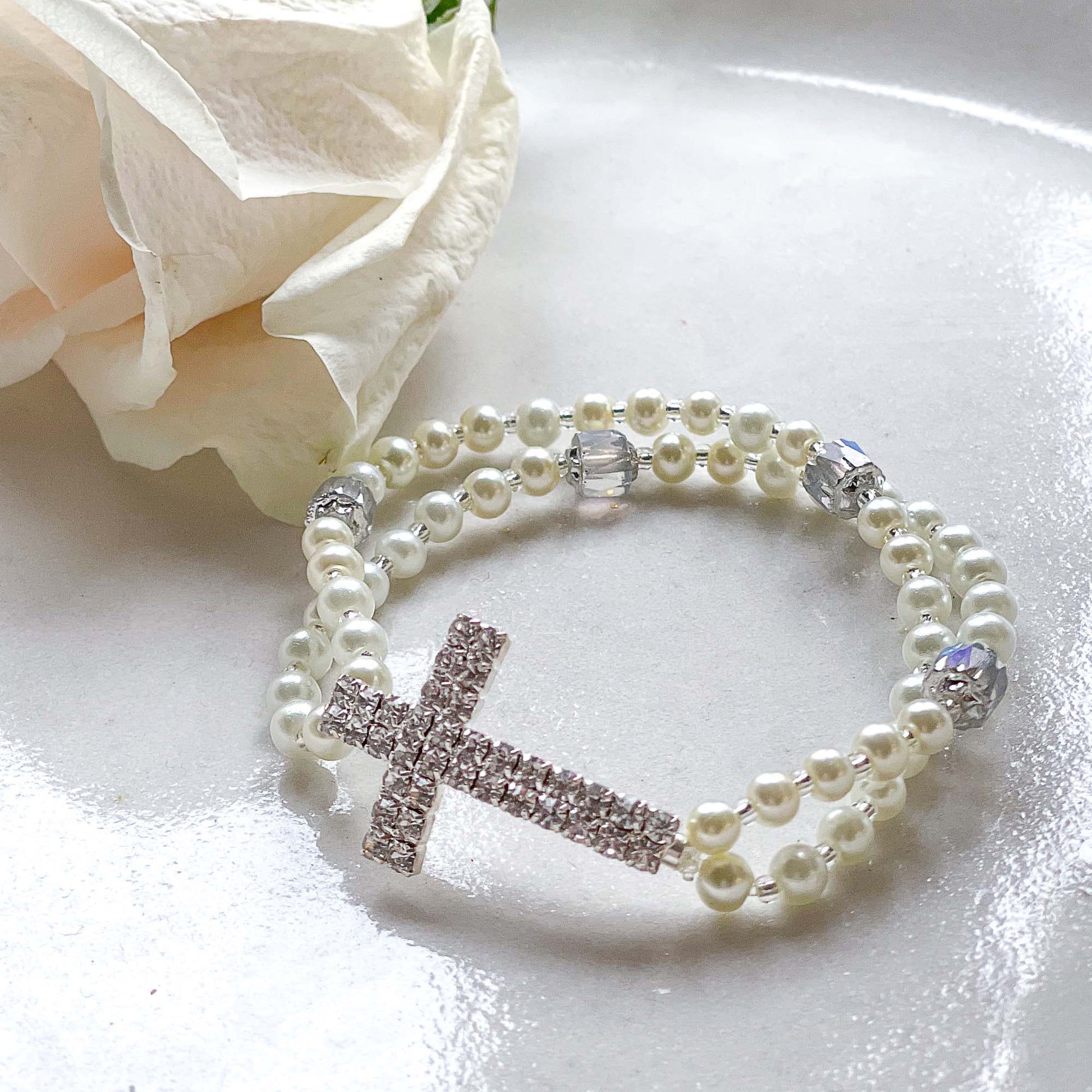 A fancy, hand-crafted bracelet with a sparkle she will love, and a memory she will treasure for years to come. Two bands of creamy, ivory, glass pearl Hail Mary beads are separated by clear crystal seed bead spacers. These are accented by gorgeous, iridescent Our Father beads that are delicately capped in silver and cubed, for a look that is unique and lovely. The centerpiece of this five-decade Rosary Bracelet is a rhinestone Cross in the popular sideways style. The pretty stretch bracelet comes safely tucked inside a small burlap gift bag. Give her a keepsake of First Communion day, and a charming gift sure to please. Includes First Communion Prayer Card with a lovely children's prayer.