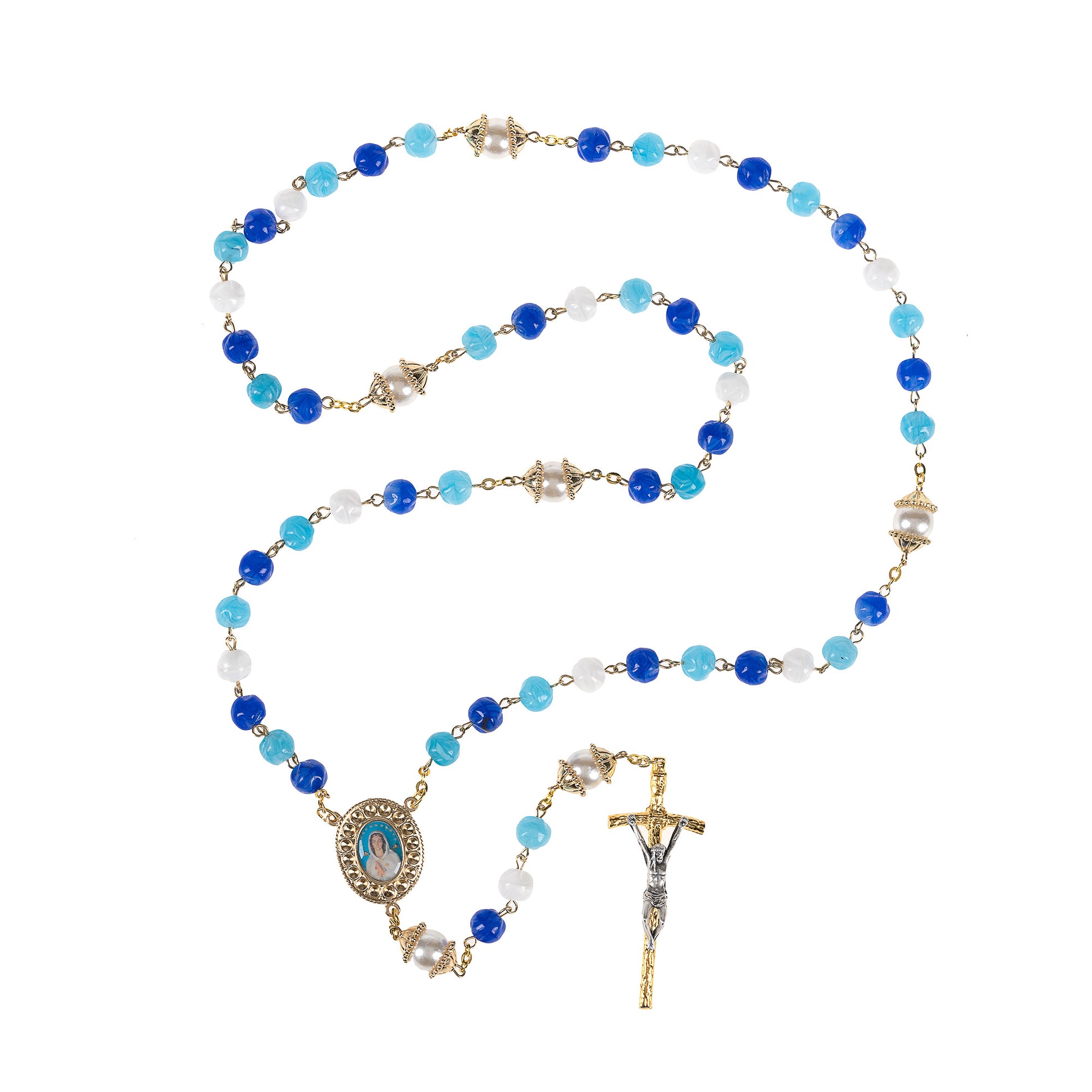 This graceful rosary features hammered glass beads in brilliant heavenly blues and whites, as a reminder that Our Lady is the Queen of Heaven, and pearlized glass Our Father beads with delicate golden caps. The centerpiece is a full-color image of Our Lady as the Mystical Rose, or Rosa Mystica, one of her titles in the Litany of Loreto. The elegant 2-tone Crucifix featuring a gold Cross and silver tone Corpus is the finishing touch. A charming Rosary for someone you cherish, and a special gift for those devoted to Mary under her title as Rosa Mystica. Made in Italy.