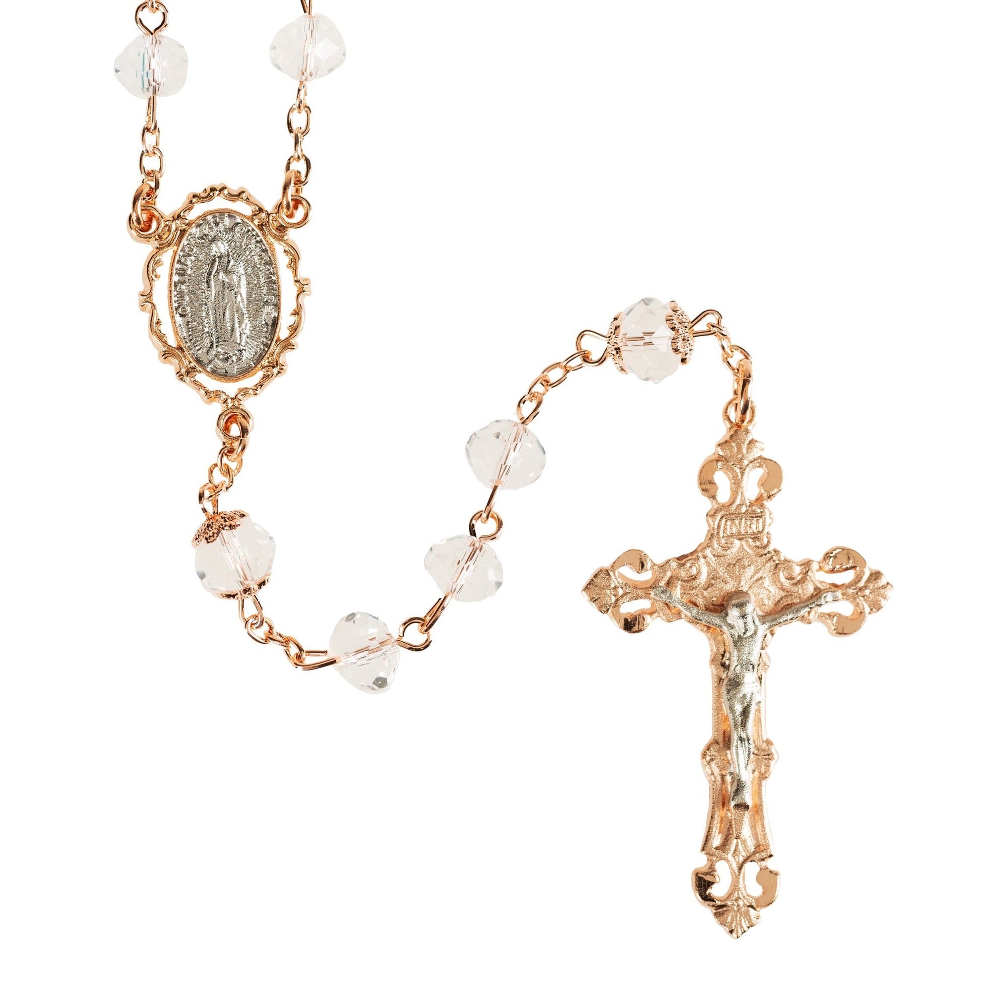This uniquely striking rosary honors Our Lady of Guadalupe, Patroness of Mexico, the Americas, and the Pro-life Movement. It features faceted, clear crystal beads, with delicately capped Our Fathers, and a two-tone, oval centerpiece of Our Lady of Guadalupe in pewter, framed elegantly in a laced cutout frame that is plated in rose gold . The distinctive Crucifix features ornate styling, cutouts and diamond-cut edging for additional shine. It is plated in rose gold and holds a pewter Corpus. A beautiful and precious gift honoring Mary and a woman you cherish, this is a rosary that will inspire her to prayer. Deluxe gift boxed.