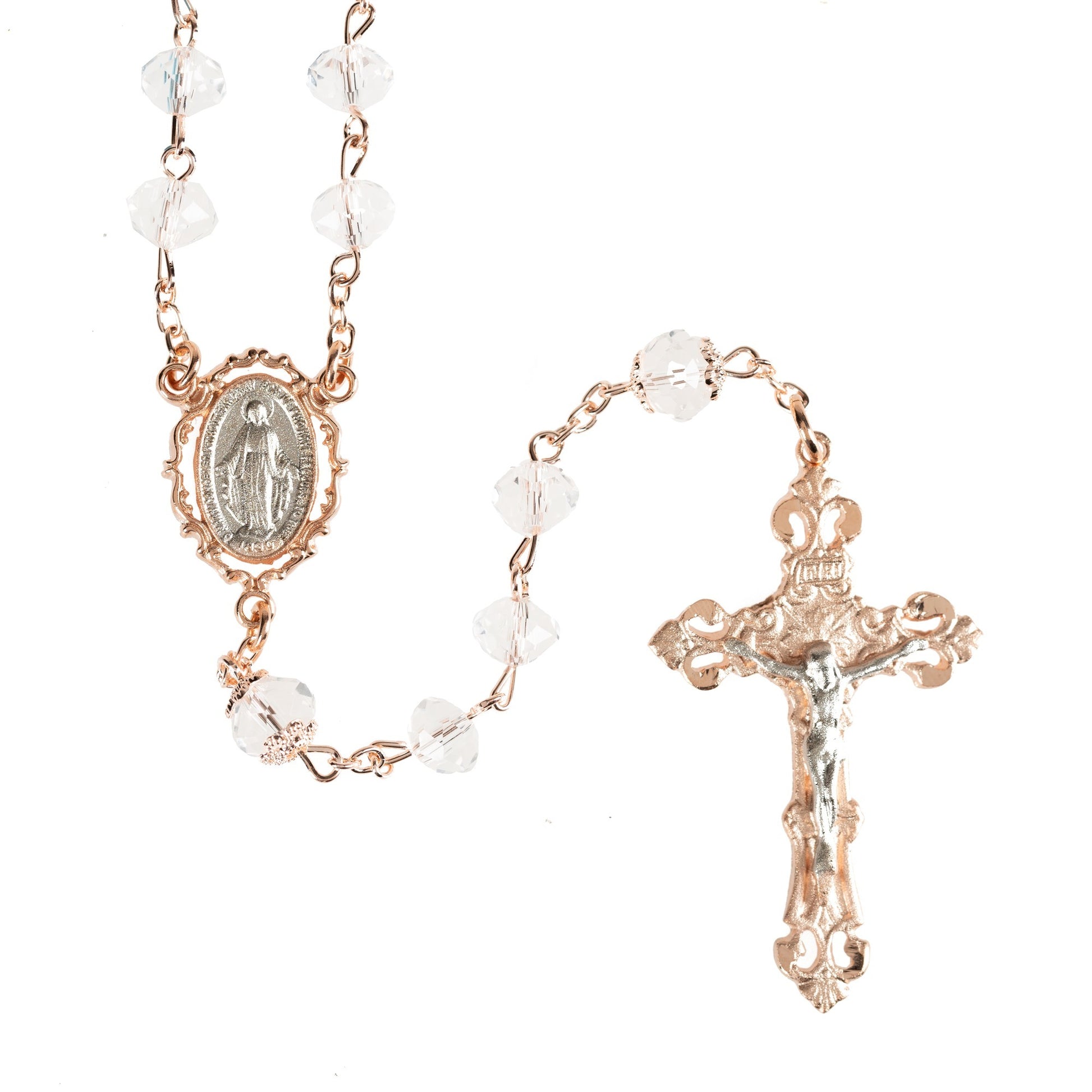 This striking rosary is made of clear crystal beads, with distinctive Our Fathers, and a two-tone, rose gold plated and pewter centerpiece which displays the Miraculous Medal. The stunning baroque crucifix completes the dazzling look, making this a piece that honors the beauty and virtue of Our Lady. Deluxe gift boxed.